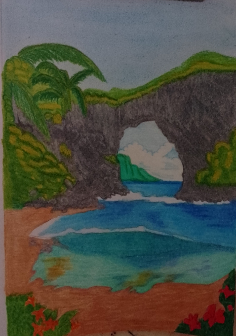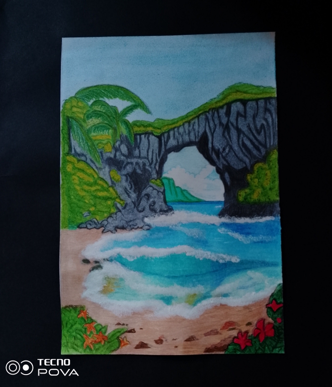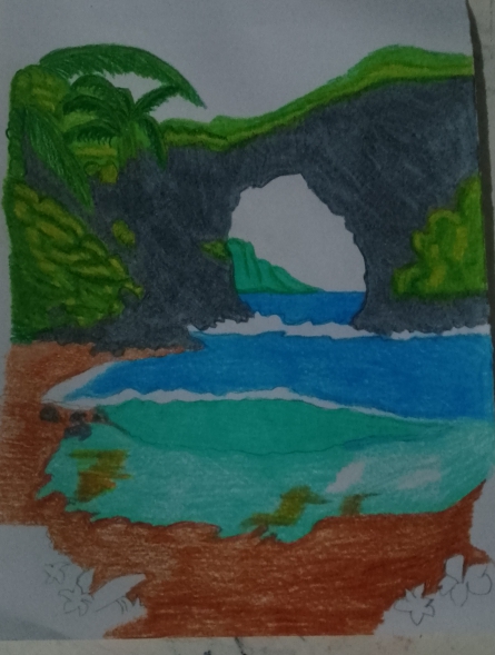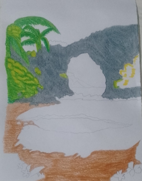 Doy inició a colorea con colores tierra pintando lo que es el muro de piedras, continuando con los árboles, pinto la orilla del mar.
