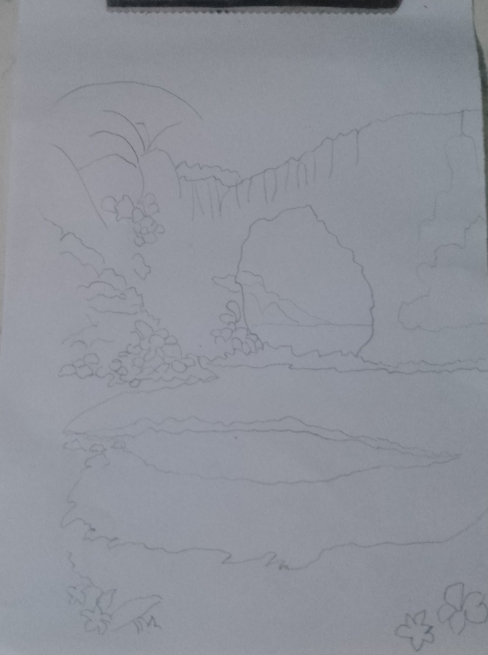 Coloreando lo que va a ser el cielo al fondo del dibujó, pinte las matas que están en la esquina inferiores ya viendo se bonito.