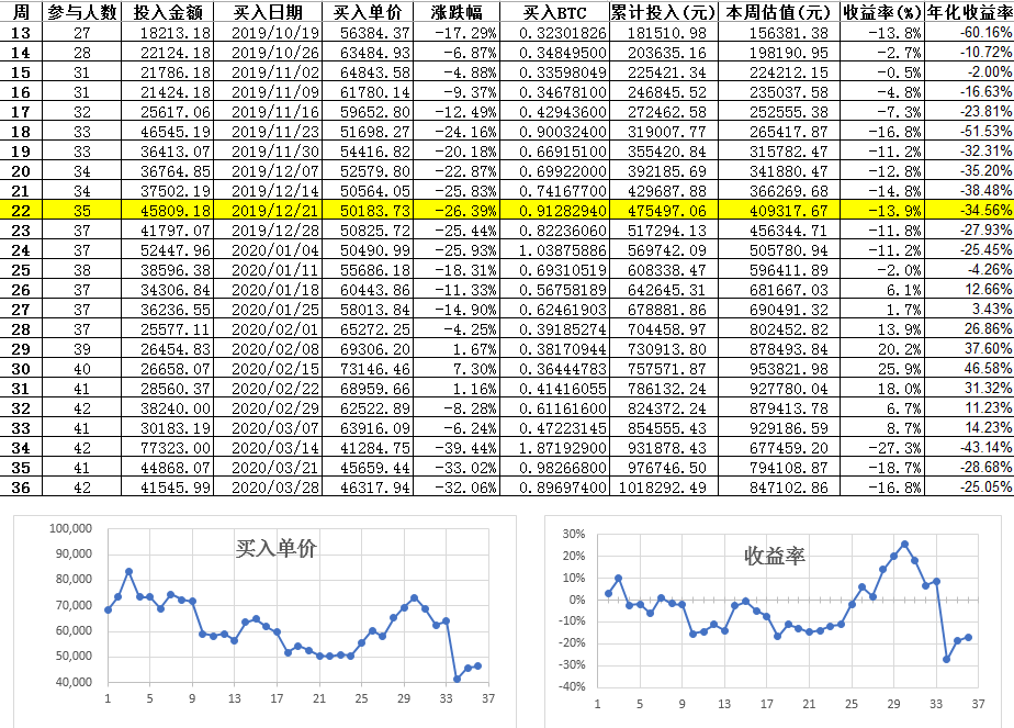 第1周的买入均价为68170元,第36周买入均价为46317.94元,逼近第22周的局部低点了,心脏不好的朋友们请绕行。