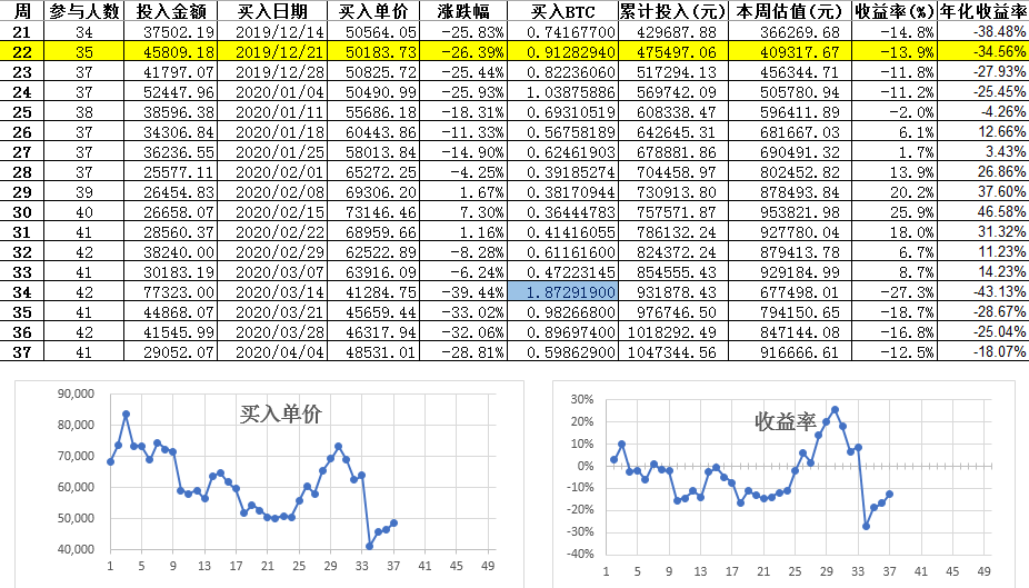 第1周的买入均价为68170元,第37周买入均价为48531.01元,逼近第22周的局部低点了,心脏不好的朋友们请绕行。