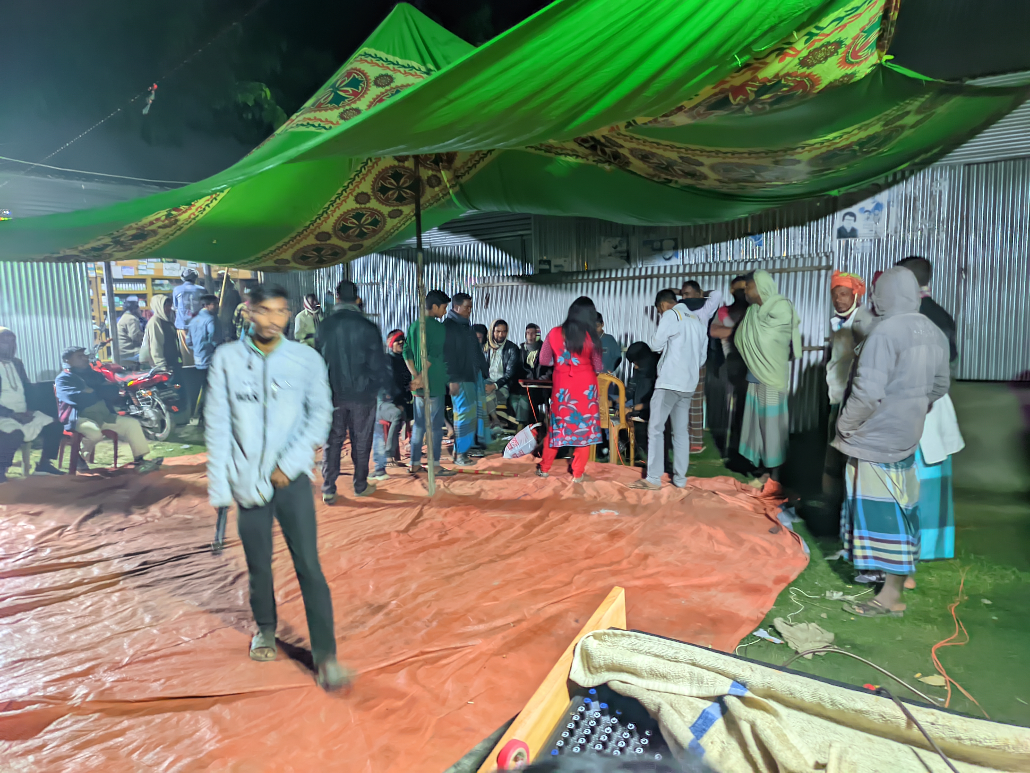 আমাদের এই মহড়ার কারণেই গ্রামের পরিবেশটা এখন অন্যরকম। রাত বাড়লেও চারপাশে একটা দারুণ ব্যস্ততা। আমাদের নাটক উপলক্ষে শুধু মঞ্চ নয়, তার আশপাশের অনেক দোকানপাটও তখনও খোলা ছিল। এই দৃশ্যটা দেখতে বেশ ভালো লাগে—শিল্পের টানে গোটা একটা এলাকা যেন রাত জেগে আছে।