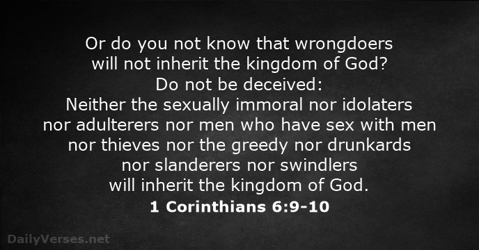 9)Do you not know that the unrighteous will not inherit the kingdom of God? Do not be deceived fornicators, nor idolaters, nor adulterers, nor homosexuals, nor sodomites,