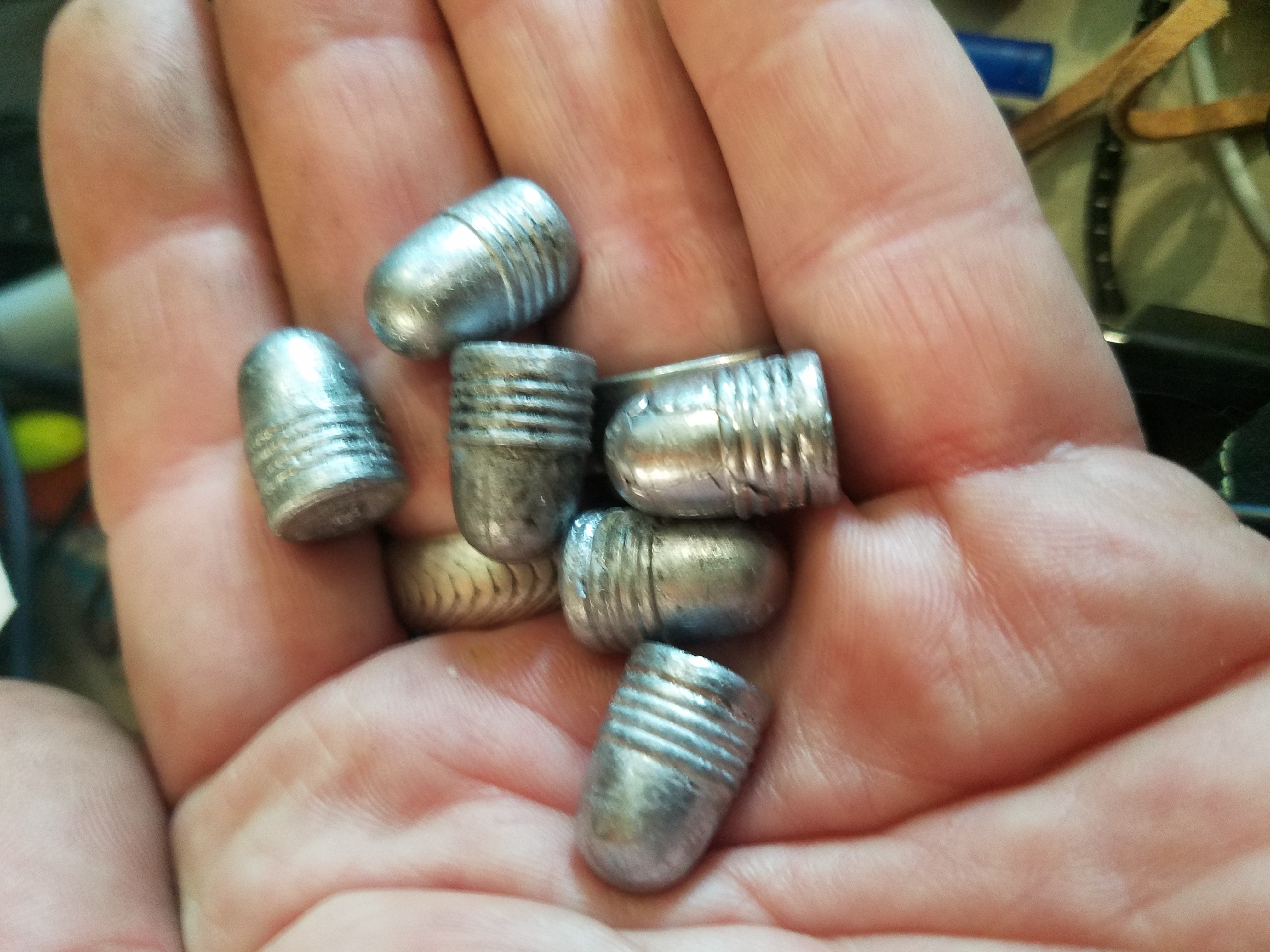 Got my Lee 45 cal mold smoked and decided to toss a few 230 grain bullets to see how it worked and break in the mold so it could drop cleaner casts. Used some range mix lead, mostly the cores of FMJ plus a few cast scrapes. No idea on the hardness but this is play right now to work on technique. Perfection will come with experience.![20190627_112727[1].jpg](https://cdn.steemitimages.com/DQma9iiQfiSbrXYBrrZSUUju7WBtSShVhNUiuaRPWHw6QDa/20190627_112727[1].jpg)
