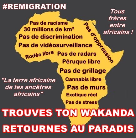 Remigration to Africa. The African land of African ancestors. All brothers between Africans. 30 million km². Free. Find your Wakanda. Go back to Heaven.