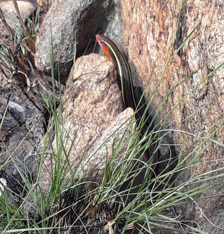 Nothing yellow-throated about this lizard, it is red! Yellow-throated Plated Lizards or Gerrhosaurus flavigularis are bigger than skinks and apparently also can be kept as pets and live for over 10 years, eating millipedes and other large insects. This one crouched there long enough for me to photograph i but then rushed off under a rock, which was presumably it's home, they live in burrows.