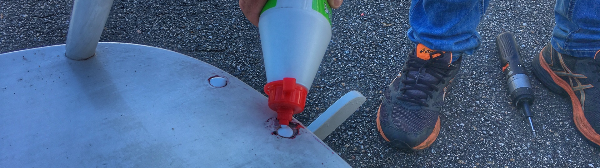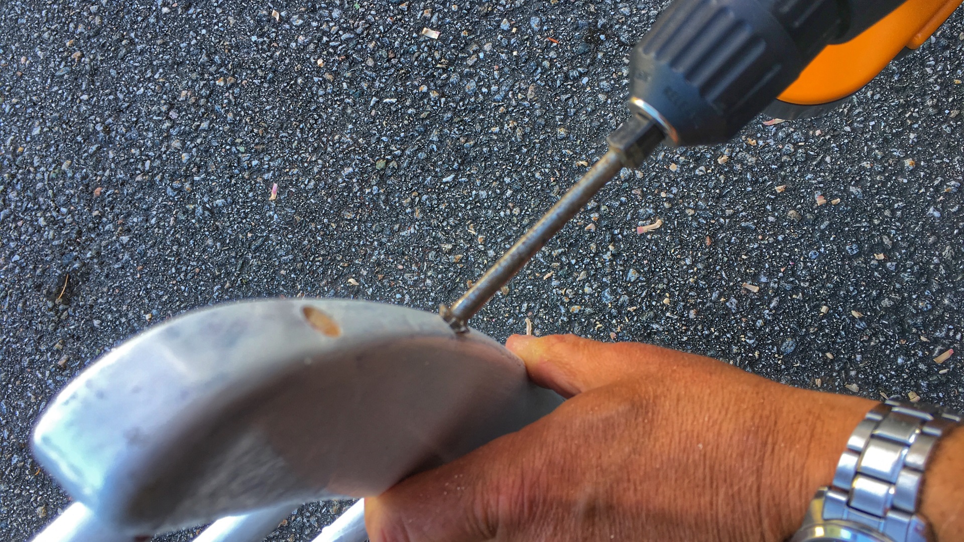 First, we drilled holes through the seat, underneath the larger holes in which the rails were mounted...