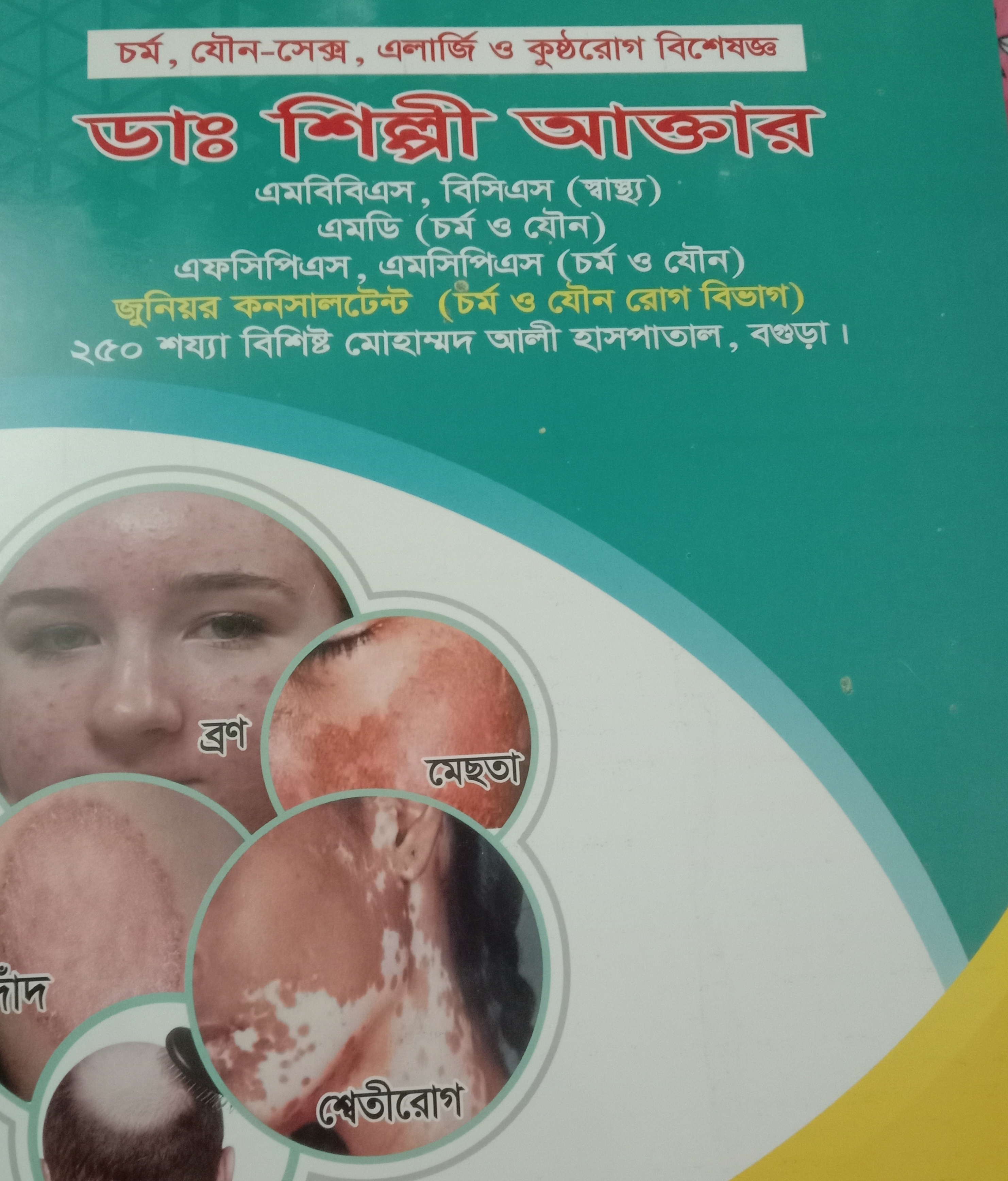 পরেরদিন সকালবেলা ঘুম থেকে উঠেই বগুড়া ইবনে সিনায় কল করলাম এবং একজন ভালো চর্মরোগ বিশেষজ্ঞের নাম জানতে চাইলাম।তখন ওখান থেকে কয়েকজনের নাম বললেন আমি বললাম সবচেয়ে যে ভালো তার একটি সিরিয়াল দিতে ওনারা শিল্পী আক্তার ম্যাম এর সিরিয়াল দিলেন।আমি নির্ধারিত সময়ের মধ্যে বগুড়ায় পৌঁছে গেলাম এবং ডাক্তারের অপেক্ষায় রইলাম।বিকেলে ৪ টায় ডাক্তার চেম্বারে আসলেন,আমার প্রথম সিরিয়াল ছিলো তাই আমি সবার প্রথমে চেম্বারের ভিতরে প্রবেশ করলাম।আমার কাছে সমস্যার কথা জানতে চাইলেন আমি বিস্তারিত জানালাম।তারপর সবকিছু পর্যবেক্ষণ করলেন এবং ঔষধ লিখলেন।