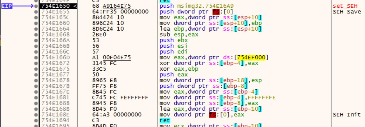 There are two very important instructions in this function: SEH save and SEH init. The code between them, I think, is the configuration of the SEH. Here is a look at the same stretch of code in the debugger.