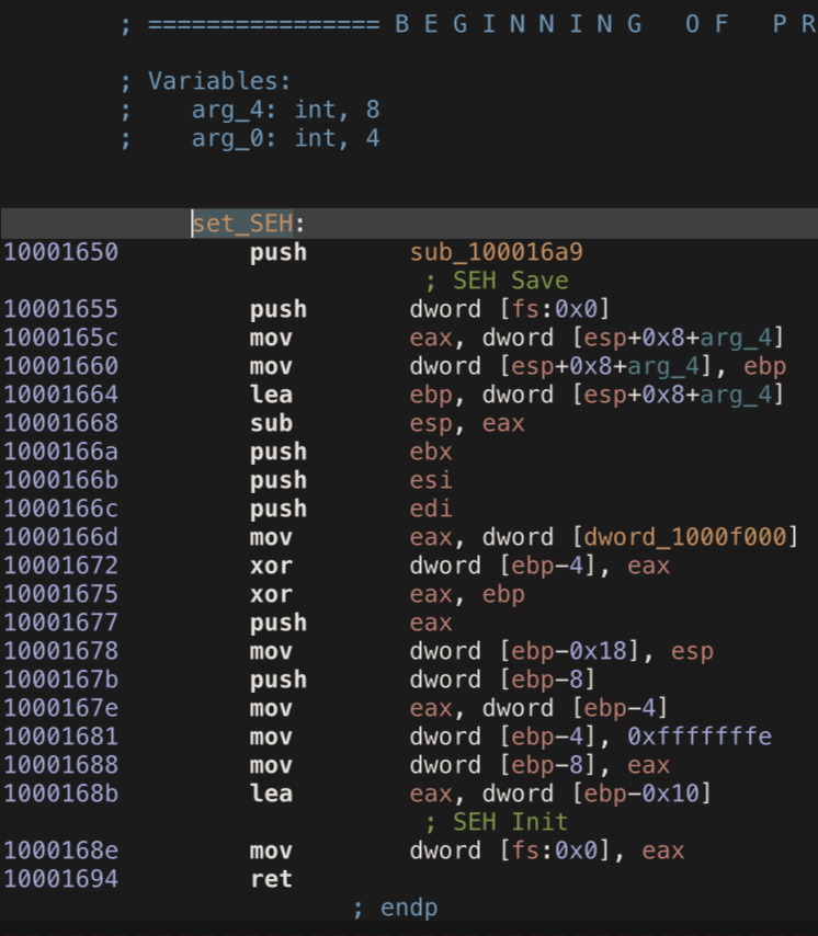 In the following screenshot of Hopper Disassembler, I’ve identified the function where the SEH is setup. I renamed it set_SEH to make it clear. If anyone knows a better way to mark this in Hopper, please let me know.