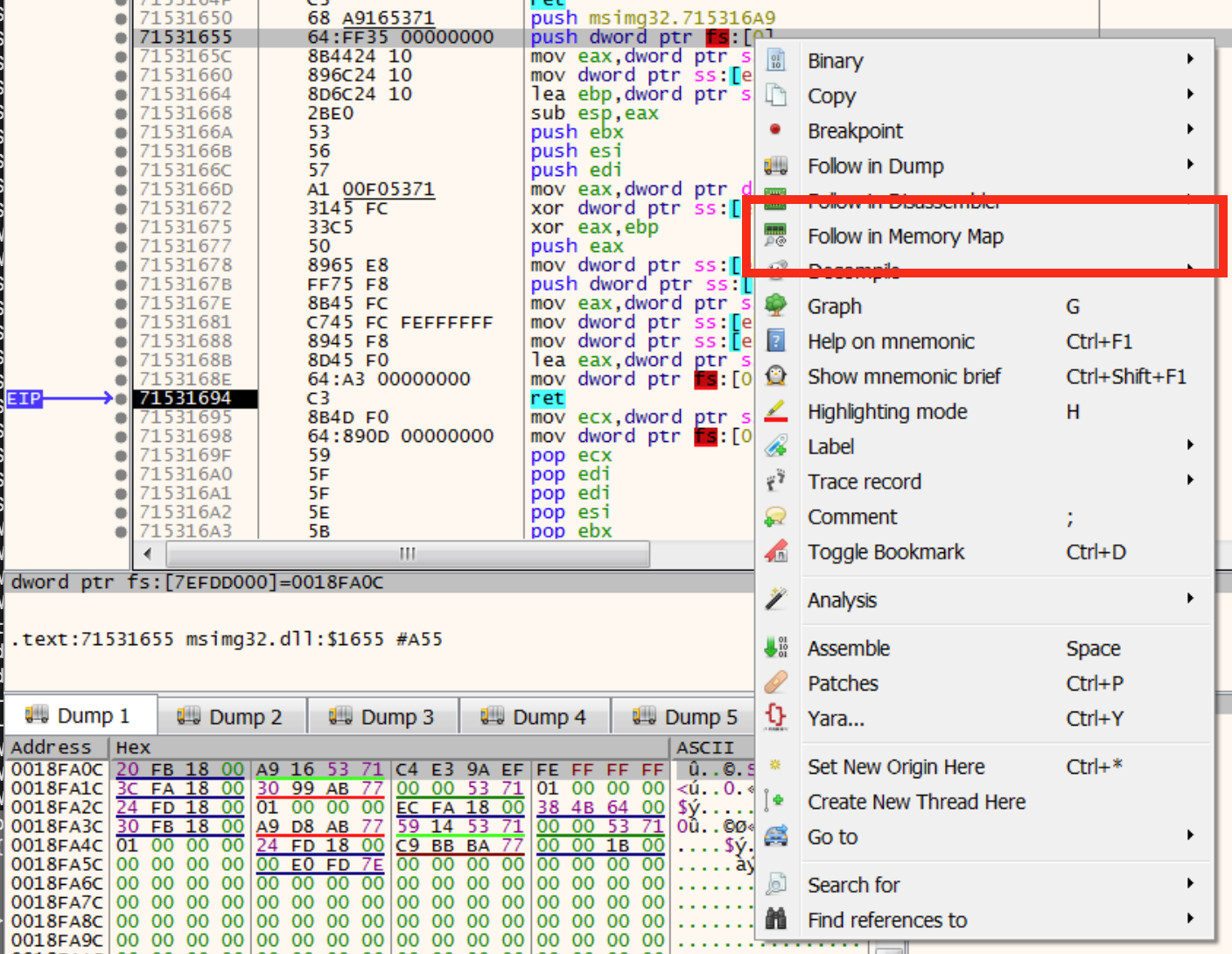 A structured exception handler (SEH) is used by software to “do something” if a particular exception is raised. It lives in register fs at fs:[0]. Malware can set a custom handler that then runs when a particular exception is raised. Then the malware does something that causes the exception to be raised. Then the custom handler with the malicious code is run. The lab rat I’m working with poses an interesting challenge for the standard SEH circumvention technique of setting a software or hardware breakpoint on the handler. It doesn’t work, or I’m doing it wrong. However, if one follows the handler pointer and sets a memory breakpoint in the memory map of x64dbg, one is able to debug the code in the handler.