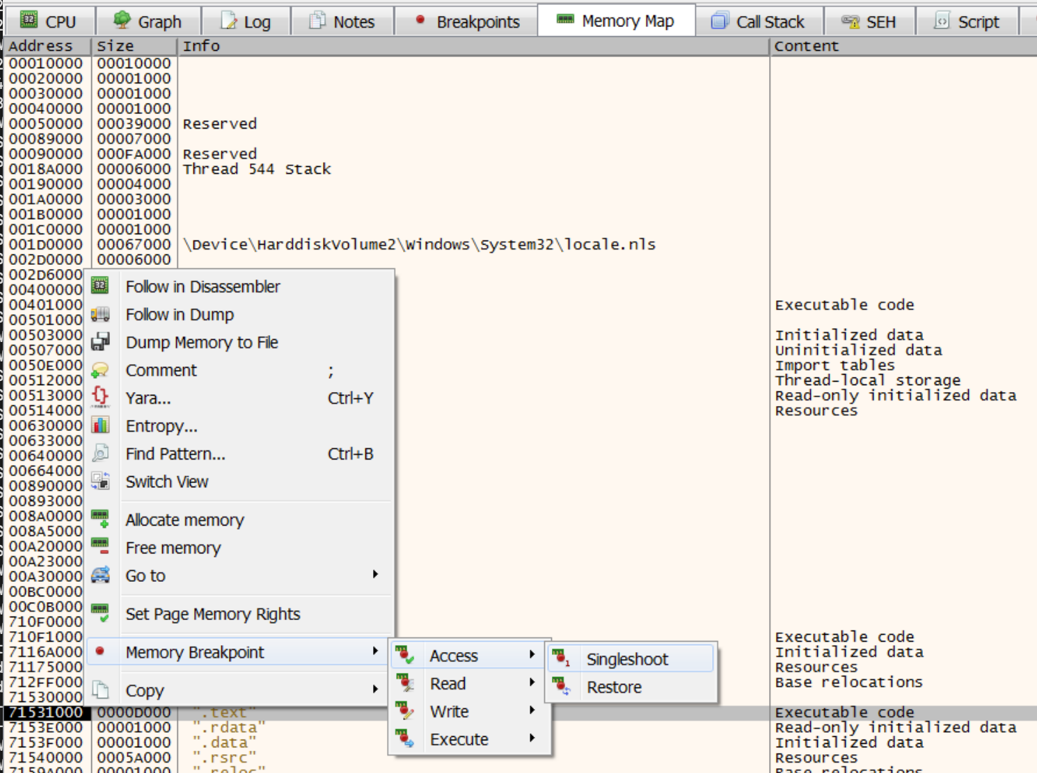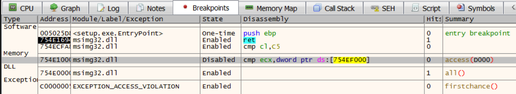 With the breakpoint set, go over to the list of breakpoints and disable it so it stays out of the way until you need it. Next, set an exception breakpoint on EXCEPTION_ACCESS_VIOLATION and proceed to the exception breakpoint. Finally, enable the memory breakpoint and step into the exception.