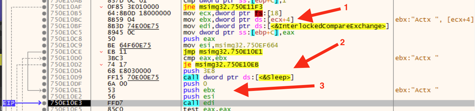 Arrow 3 is the set of input parameters for InterlockCompareExchange: 0, “Actx “, and an address in the malicious DLL. This stretch of code includes a comparison that can cause sleep to occur (arrow 2). This is important to note so that it can be patched to disable the sleep if needed later on. I am not sure if this is important yet, but sleep can be poisonous to sandbox analysis. Knowing where it happens can allow you to patch it out in an automated way. This lets future samples run in Cuckoo Sandbox easier.