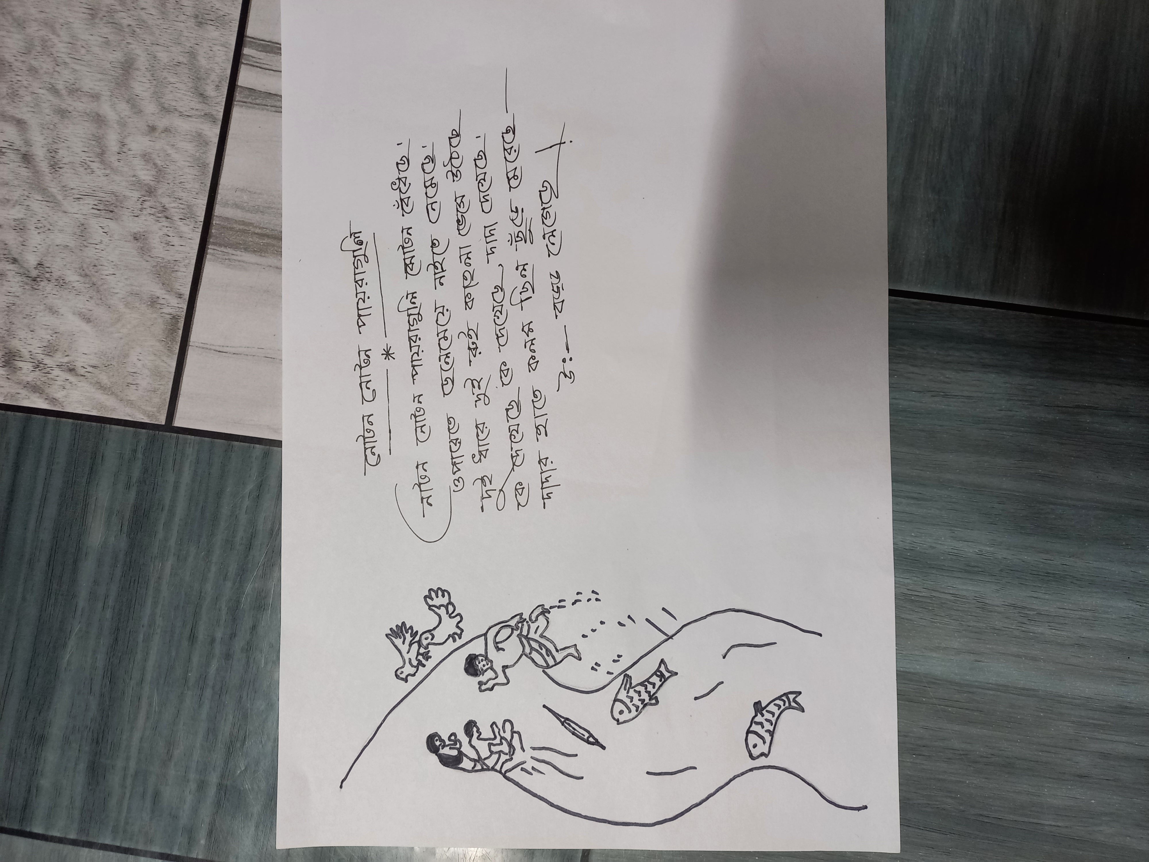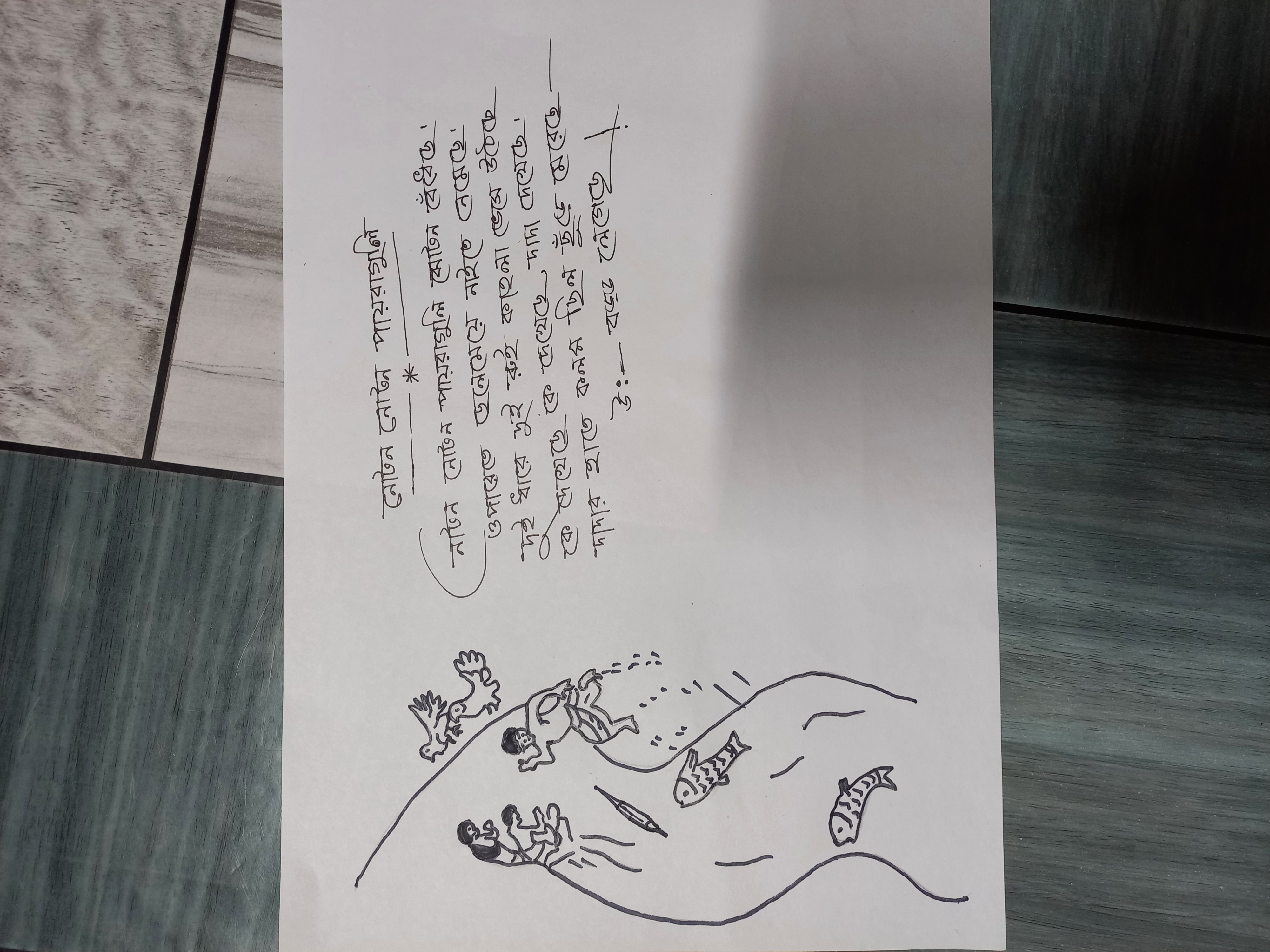 - একটি ছেলে ও একটি মেয়ে নদীর ওপারে অঙ্কন করলাম যারা নাইতে নেমেছে অর্থাৎ গোসল করছে।