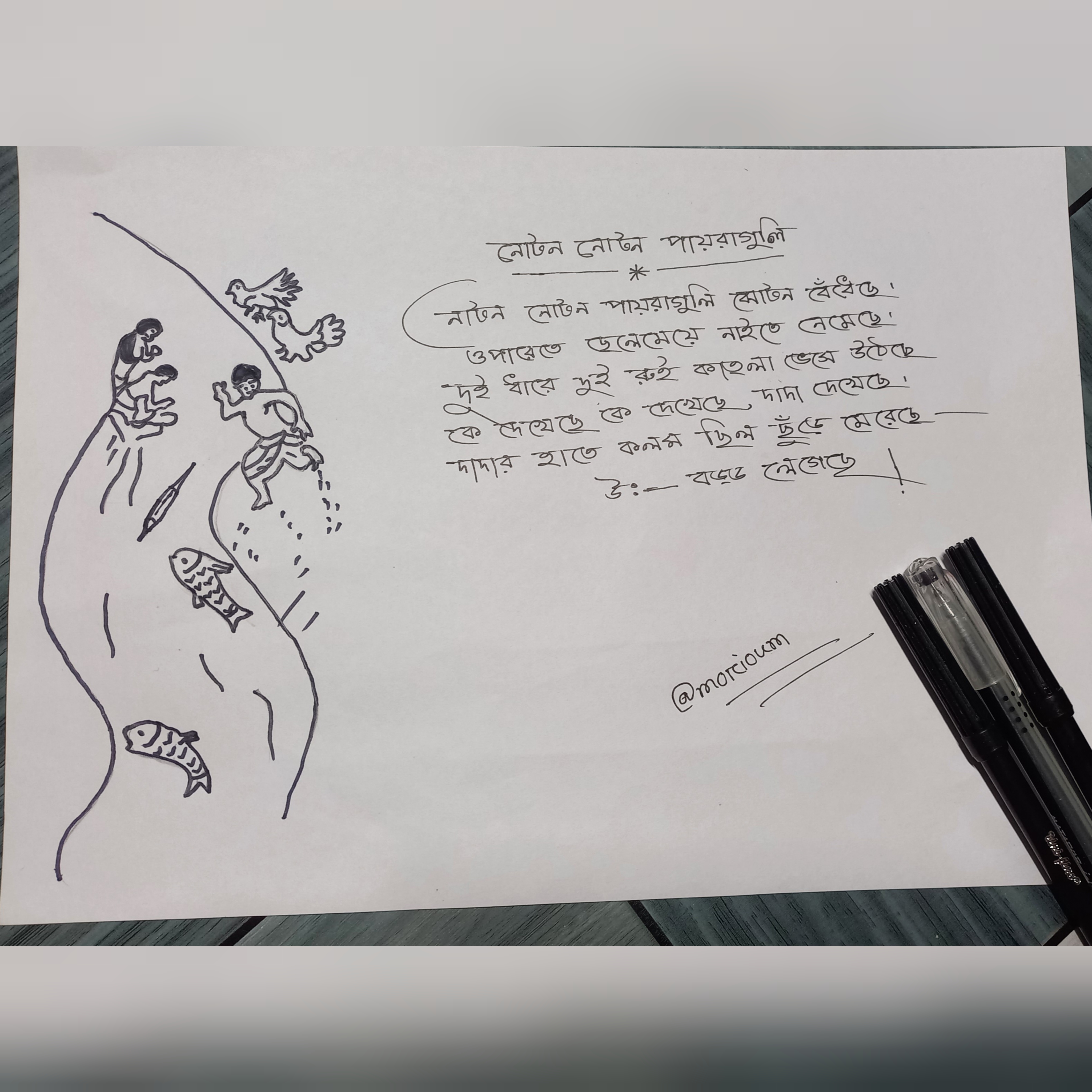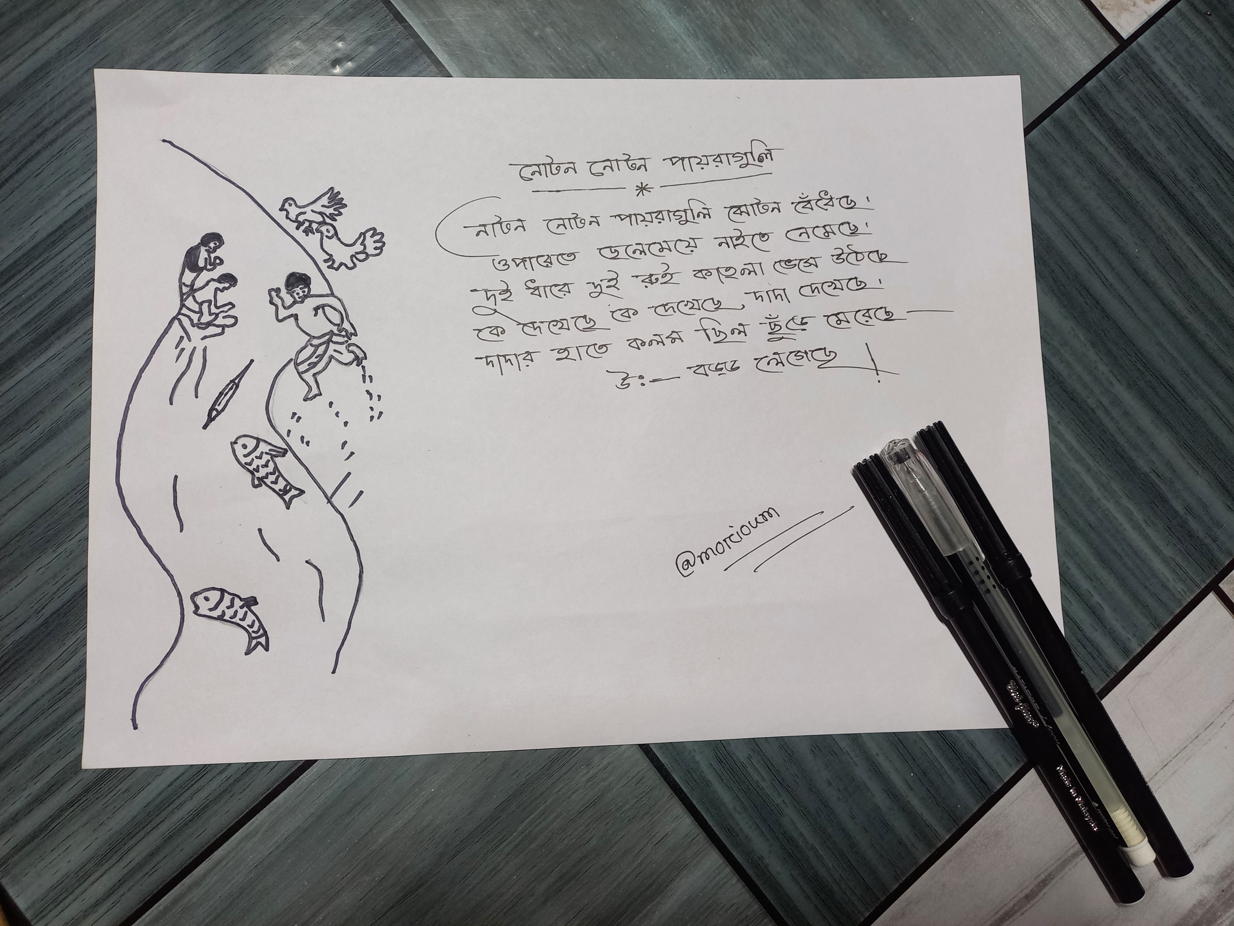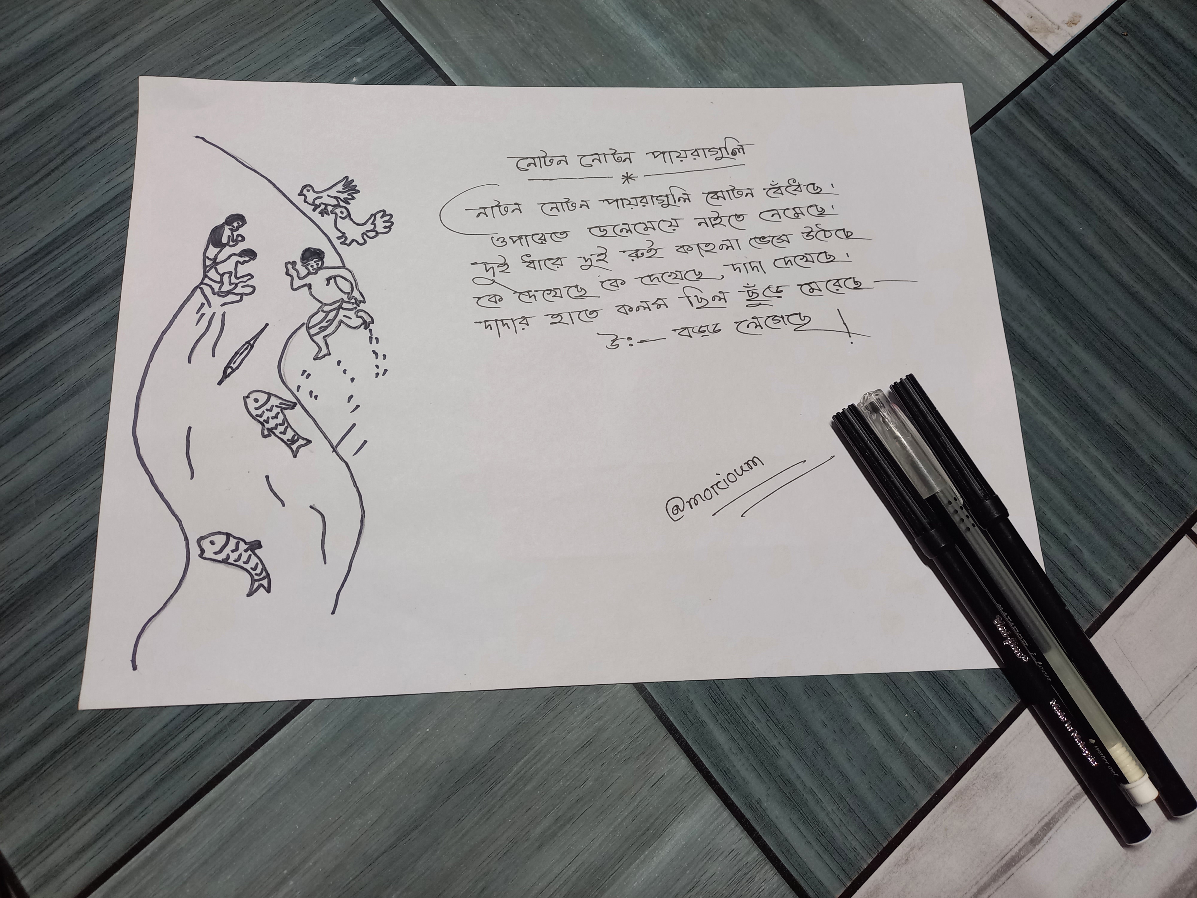 - এবার নতুন নতুন পায়রা গুলি কবিতাটি চিত্রের একপাশে লিখে ফেললাম।