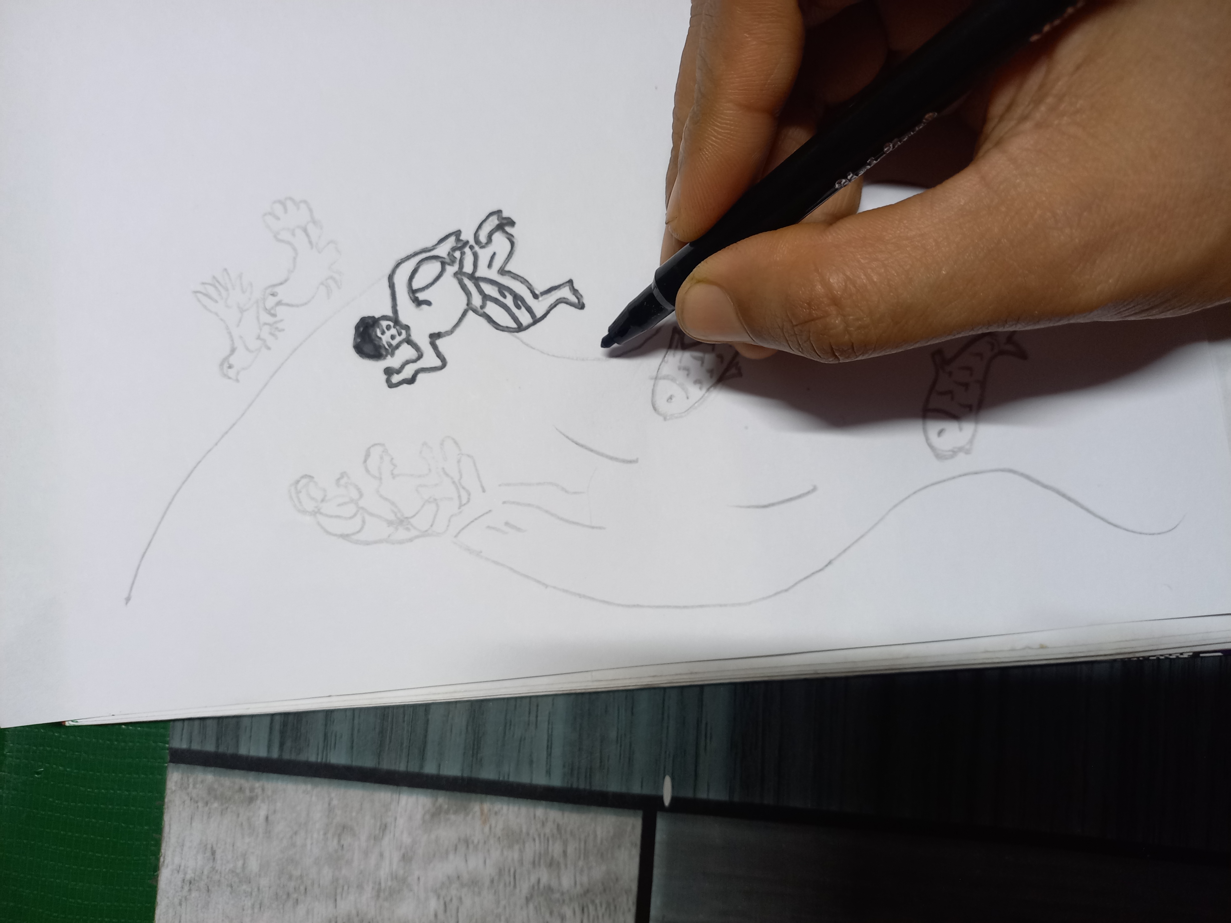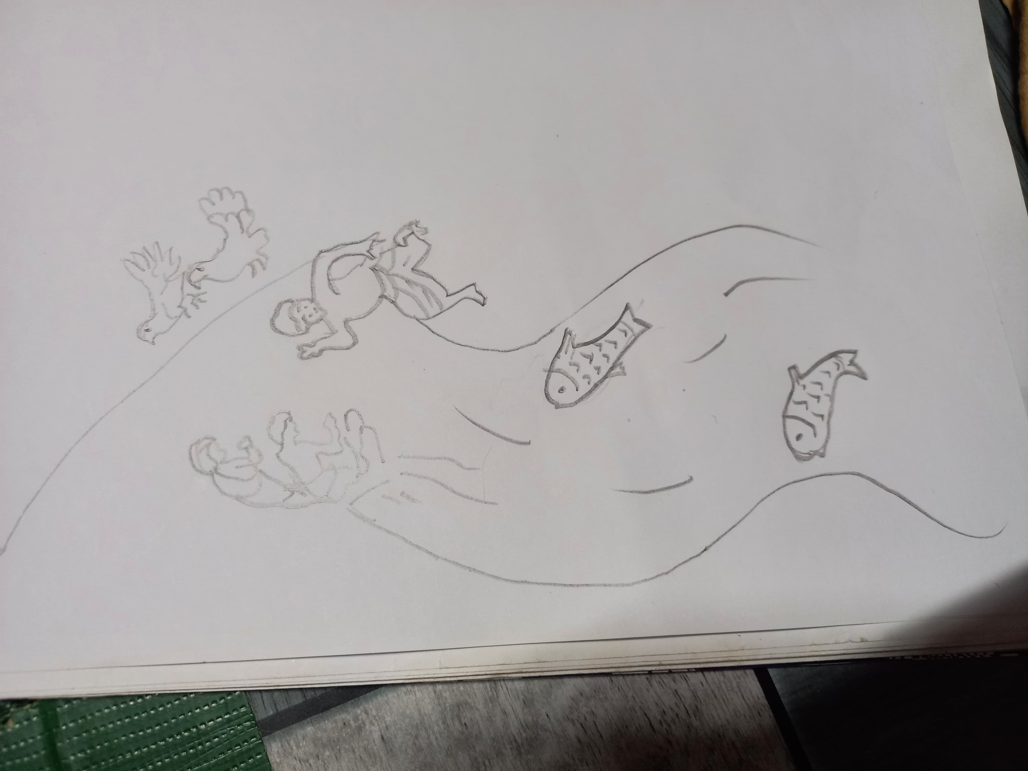 - এবারে দুই ধারে দুই রুই কাতলা ভেসে ওঠা অঙ্কন করলাম।