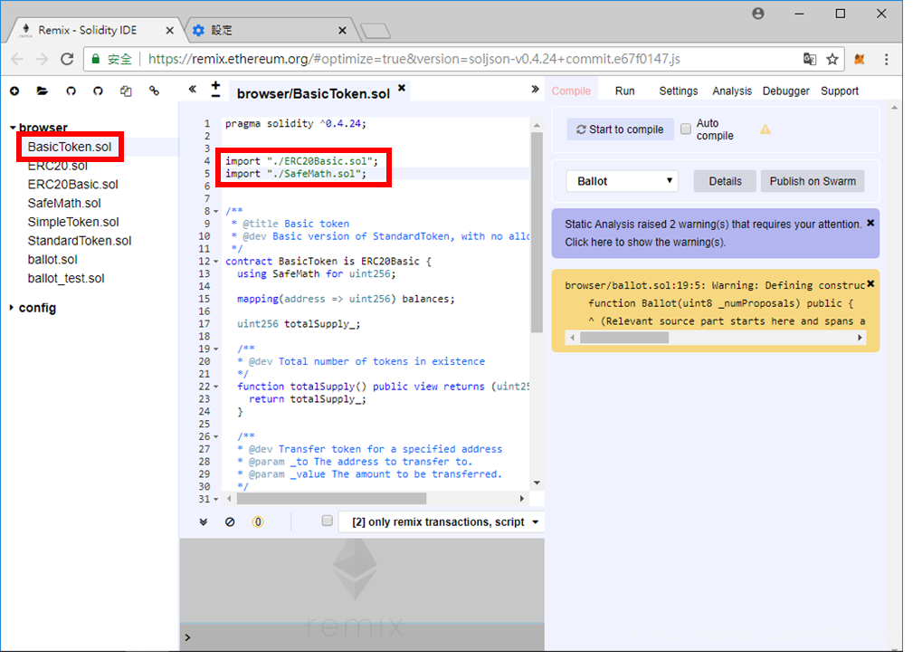 (6)此時因為每一個檔案在 Remix 編譯環境均在同一個「browser」目錄底下,故要進行修正,首先修改 BasicToken.sol 檔第 3 列(修改 import 位址):