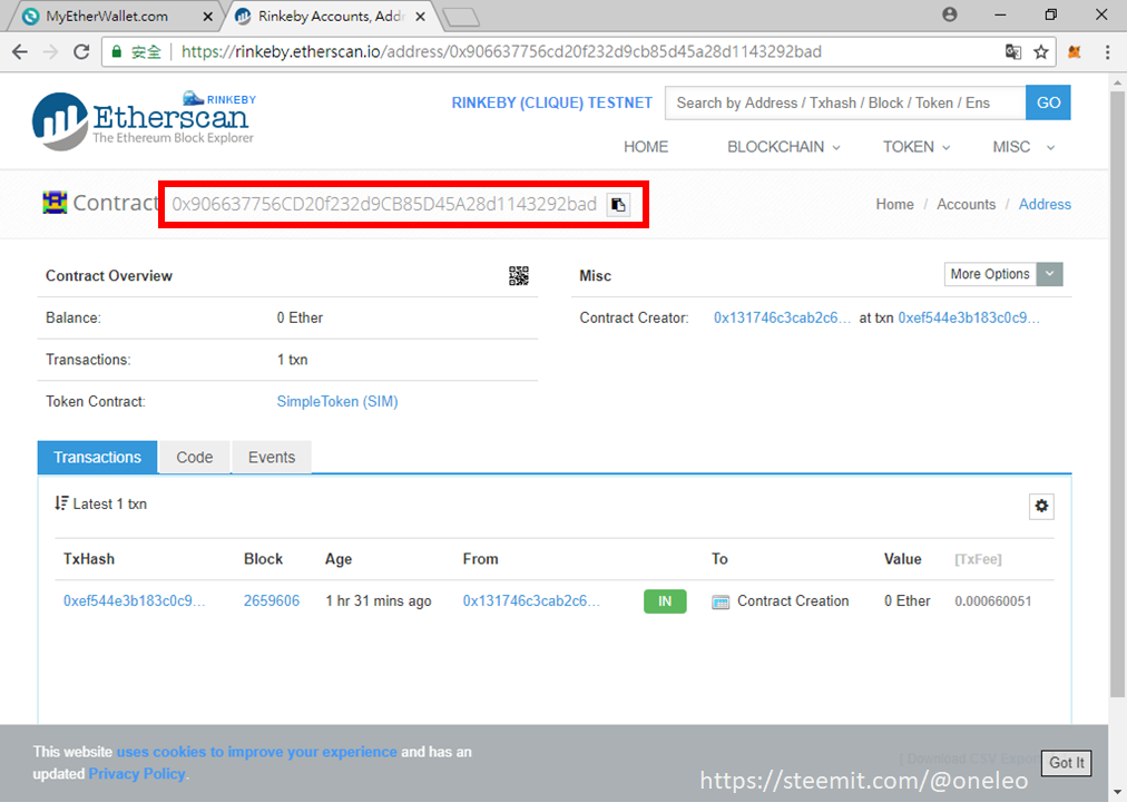 (6)就可以看到這條 ERC20 智能合約的地址了(本處智能合約地址為:0x906637756CD20f232d9CB85D45A28d1143292bad)。