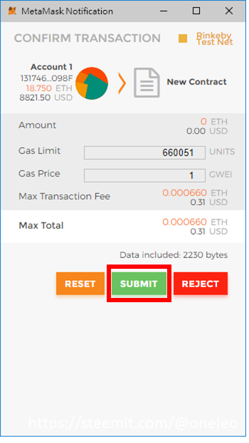 (10)因為部署智能合約需要支付手續費,此時會自動跳出 MetaMask 支付以太幣通知,因為之前已取得數枚測試用以太幣,所以直接點選【SUBMIT】支付。
