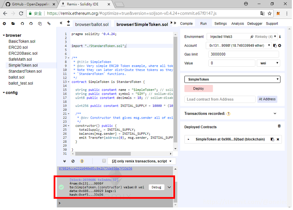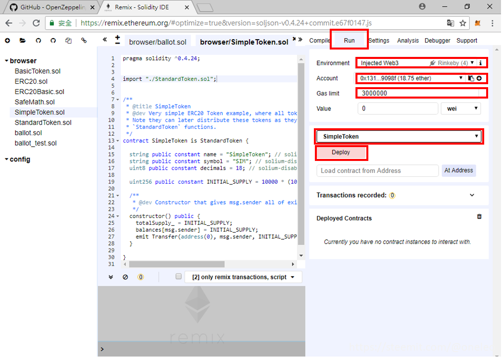→ 接著點選要部署到以太坊 Rinkeby 測試網路的【SimpleToken】檔案 → 再來點選【Deploy】開始部署。