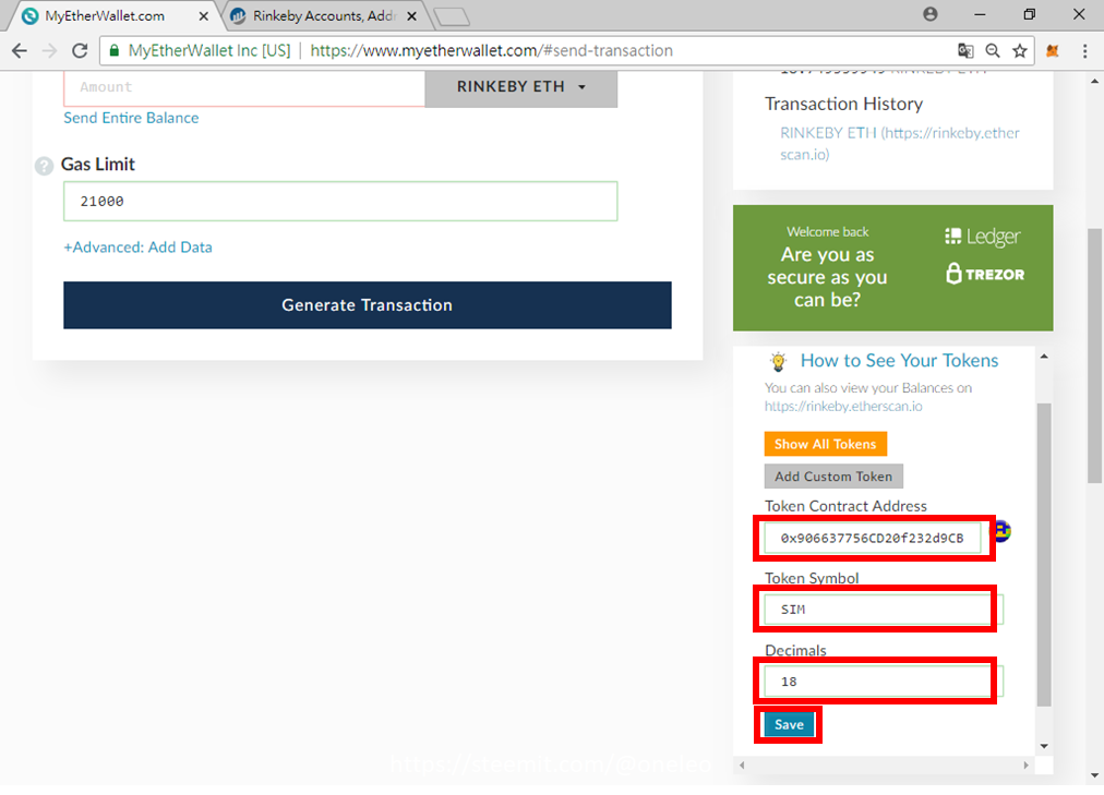 (4)此時會要求我們輸入 SIM ERC20 Token 智能合約的地址,假設我們已忘記此 ERC20 智能合約的地址了,所以點選瀏覽器右上角的【MetaMask】是選到以太坊【Rinkeby Test Net】→ 再點選「Account 1」右邊的【…】→ 再點選【View account on Etherscan】開啟錢包瀏覽器。