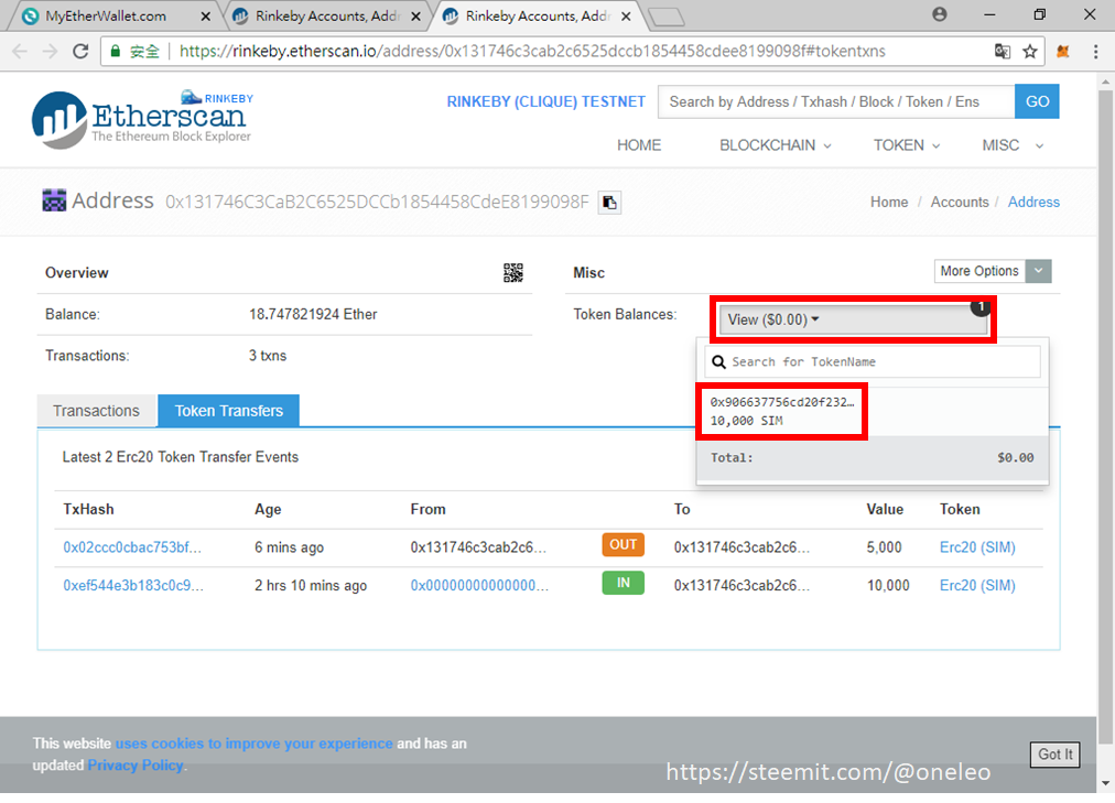 (13)這邊就可以看到剛才的 SIM ERC20 Token 確實有成功轉出,但是是因為是轉回到自己的地址,所以點選「Token Balances:」右邊的【View ($0.00)】可以看到 SIM Token 仍然是 10,000 顆。