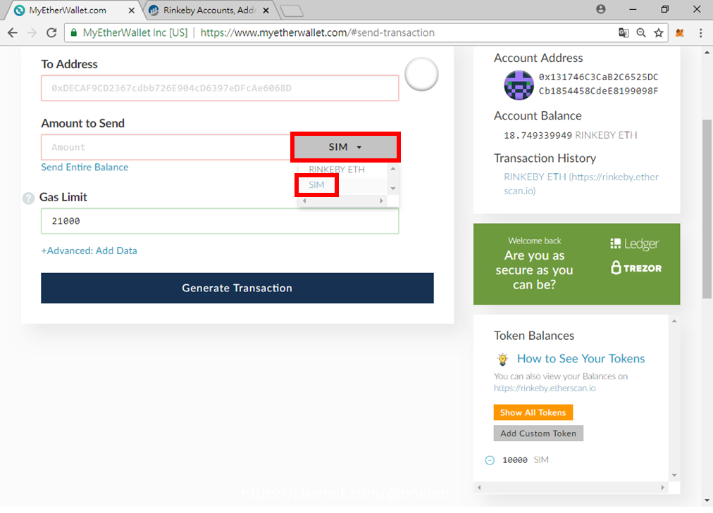 (8)新增完成後,即可在「Amount to Send」右側點選到【SIM】ERC20 Token 了。