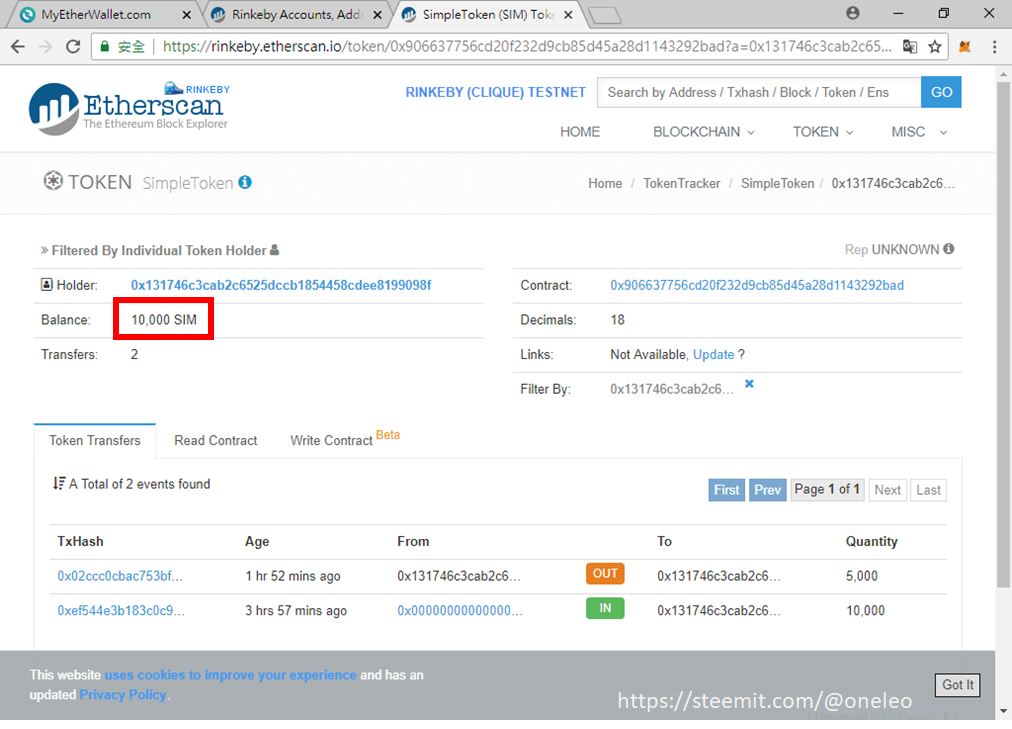 4、下一步就是要將以太坊 Rinkeby 測試網路的 SIM ERC20 Token 轉到其他帳戶底下(這邊為方便起見,是將 SIM Token 轉到自己的 Account 1 地址下)。