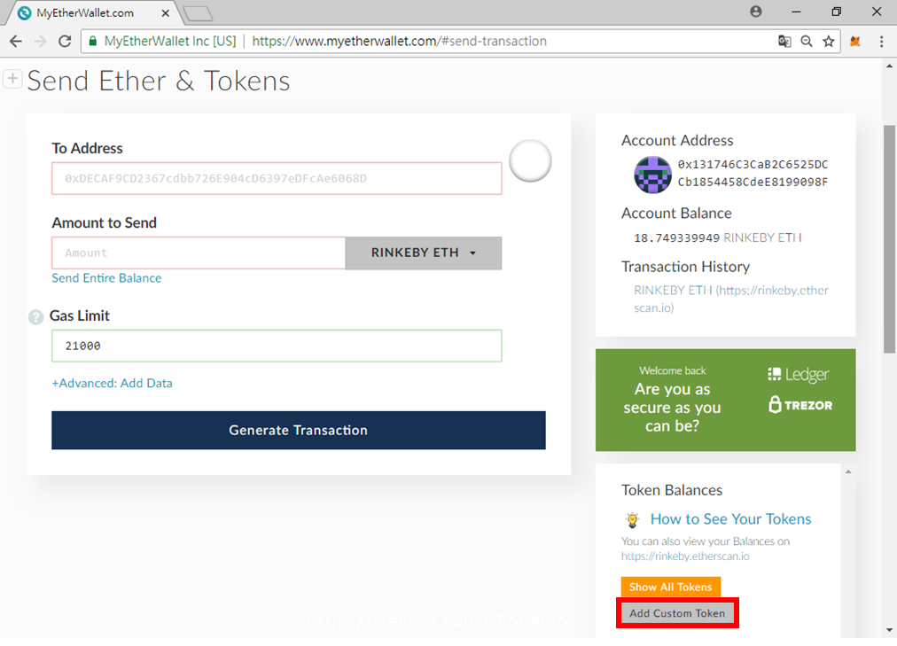 (3)點選【Connect to MetaMask】後 MyEtherWallet 會和目前的 MetaMask 帳號連動,並進到錢包主控台,我們直接點選右下角的【Add Custom Token】。