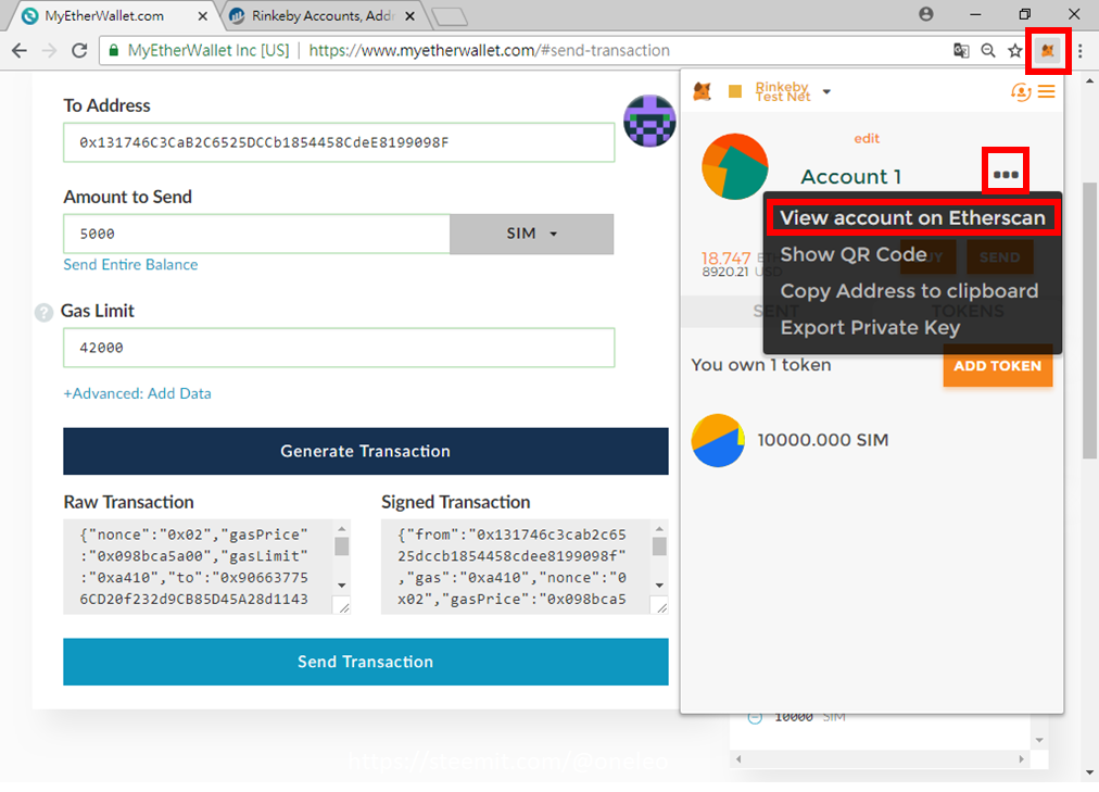 (11)確認 SIM Token 是否有成功轉出,點選瀏覽器右上角的【MetaMask】→ 選到以太坊【Rinkeby Test Net】→ 再點選「Account 1」右邊的【…】→ 點選【View account on Etherscan】鈕。