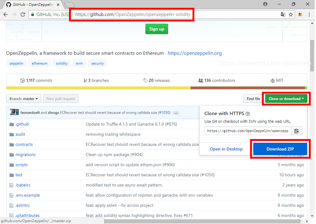 (1)至 https://github.com/OpenZeppelin/openzeppelin-solidity 點選【Clone or download】下載 OpenZeppelin 專案。