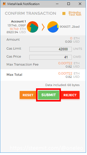 (10)因為轉 ERC20 Token 也需要支付手續費,此時會自動跳出 MetaMask 支付以太幣通知,直接點選【SUBMIT】支付。