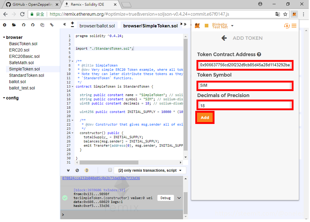 (7)同樣,修改 SimpleToken.sol 第 4 列(修改 import 位址);以及可順便更改第 15 列(自行定義的 Token 名稱)、第 16 列(自行定義的 Token 縮寫):