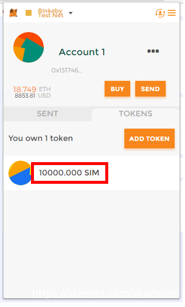 (14)此時就可以在 MetaMask 上看到「Account 1」帳號底下已經有10000.000 顆 SIM ERC20 Token 入帳了。