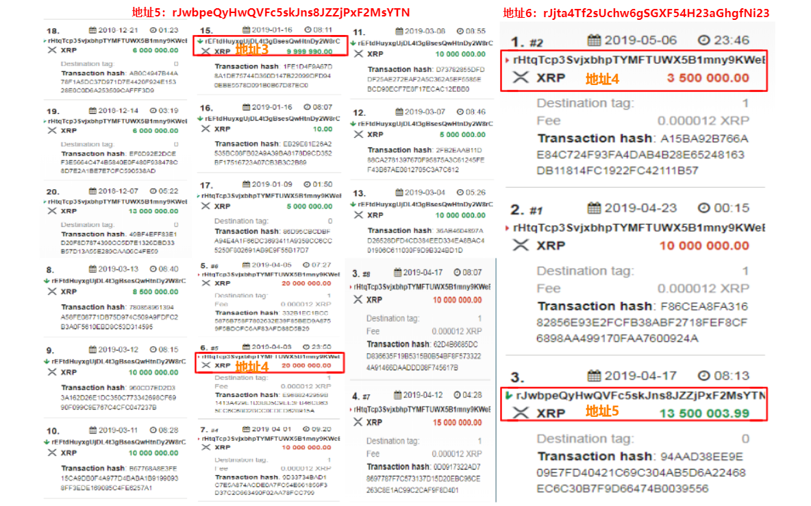 为了考证这一说法,哈希派开始翻找Ripple官方地址的过往交易记录,于是我们发现了几个可疑的地址。