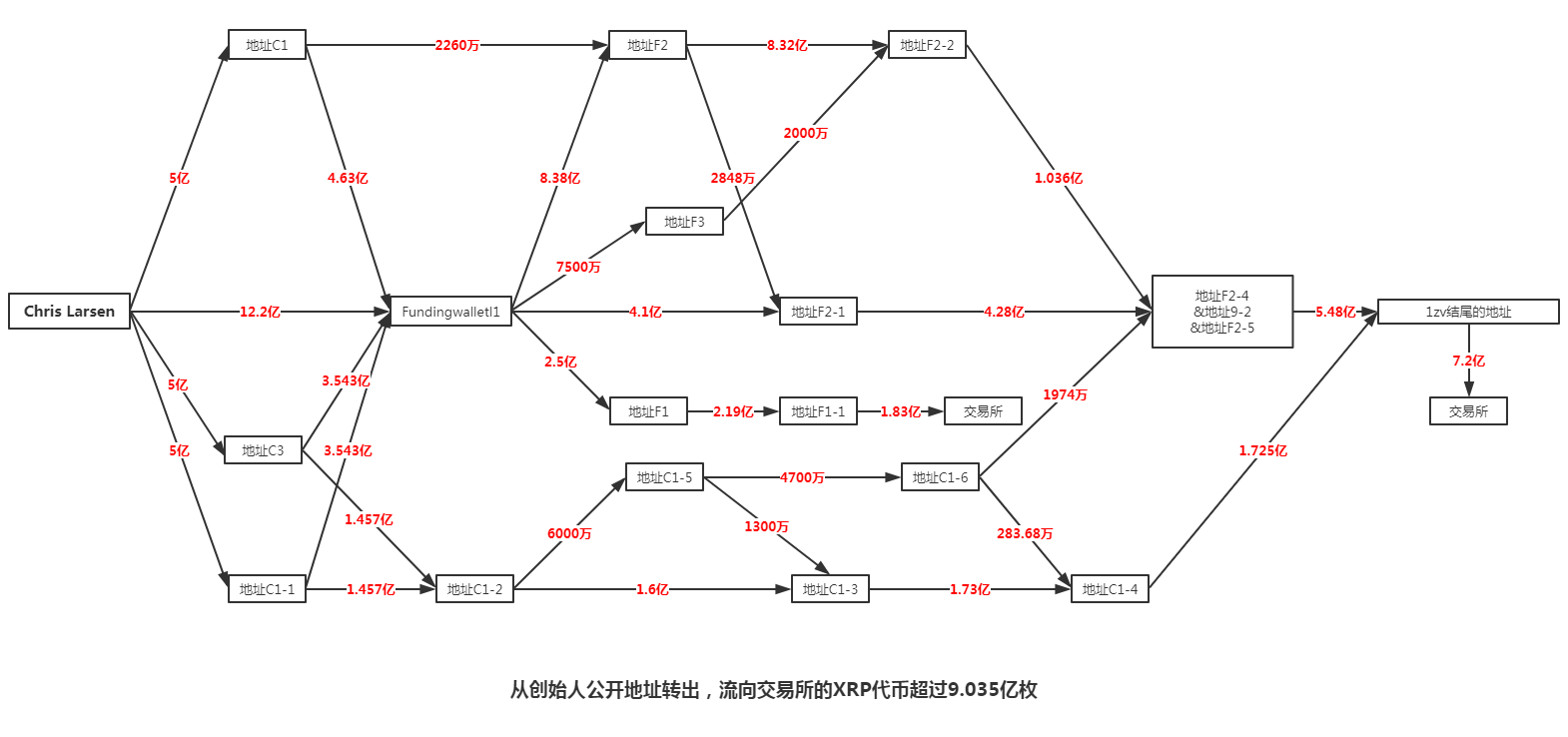 一年时间内,从Chris Larsen个人地址转出,流向交易所的XRP超过了9亿枚。