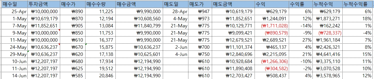 위 도표에서 볼 수 있듯이 6월 14일 오후 2시 현재 12%의 수익률로 3,578,965원의 수익을 기록하고 있습니다.