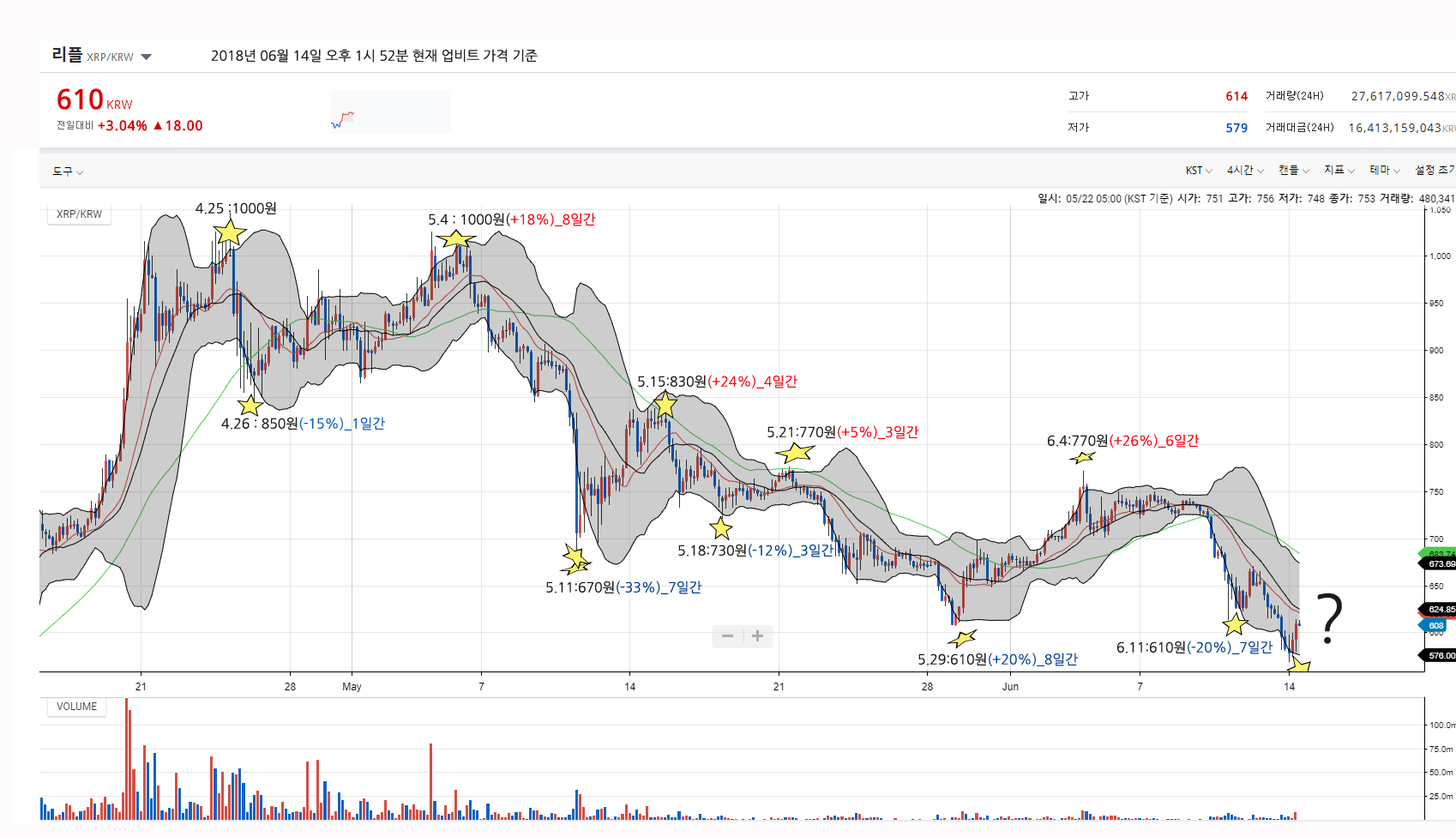 2018년 4월 25일 고점에서 6월 14일 오후 2시경까지 4시간 봉챠트에 블린져밴드를 넣어 분석했습니다.