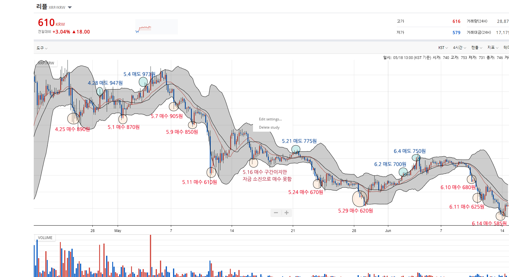 4시간봉챠트에 블린저밴드를 적용하여 4월 25일부터 현재까지 리플의 가격 움직임을 분석해 봤습니다.