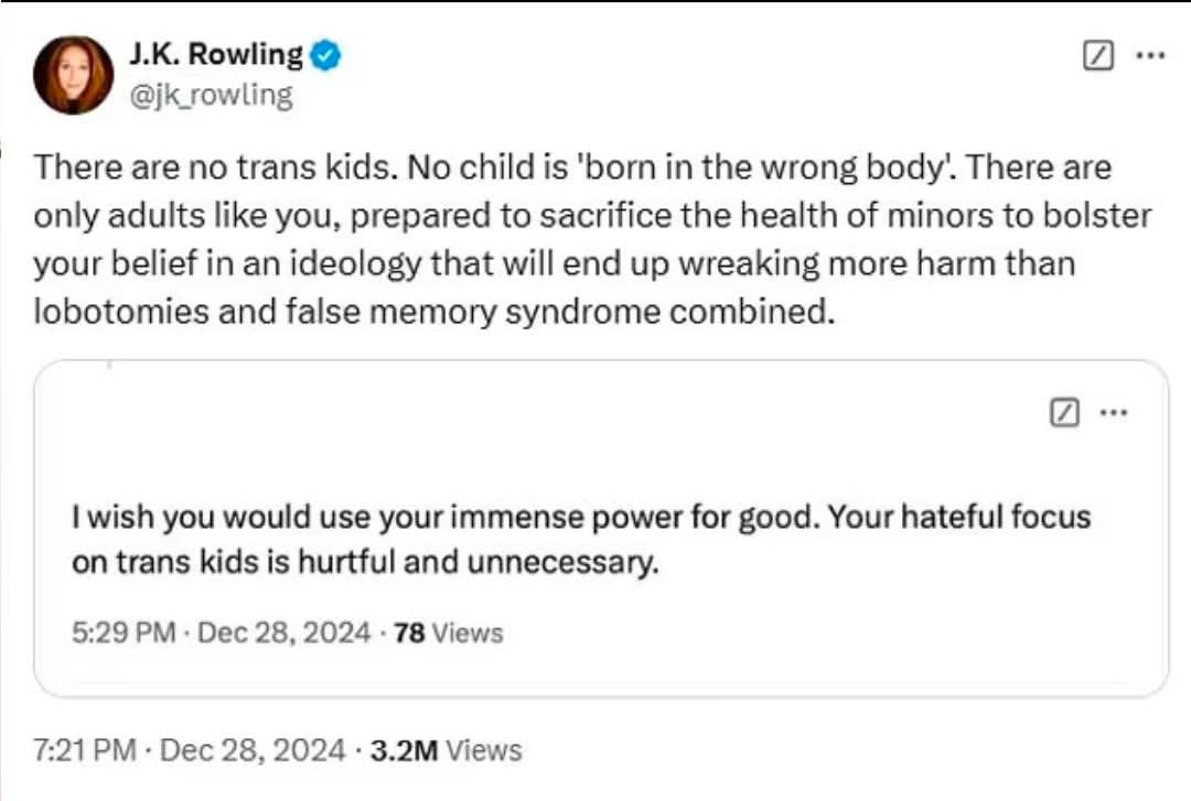 Anywho, even if a person agreed with her it still wouldn't explain why this person who could have spent her entire life being beloved, spending her billions to help people and hanging out in her musty ass castle (look it up) instead spends every day making life hell for trans people in every way she can.