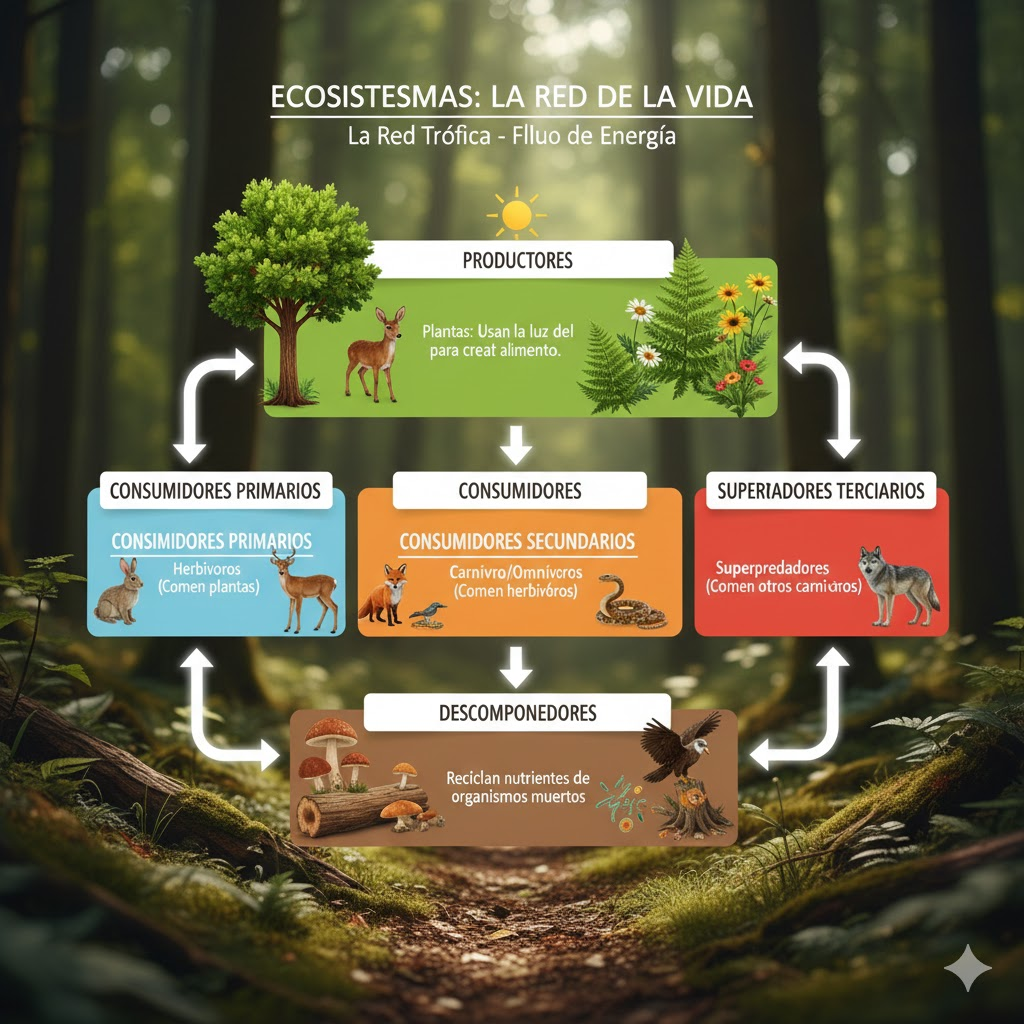 Dentro de cada ecosistema, los organismos desempeñan roles específicos. Las plantas son productores, utilizando la energía del sol para crear su propio alimento. Los animales son consumidores, obteniendo energía al comer otros organismos. Los hongos y bacterias son descomponedores, reciclando nutrientes de organismos muertos. Esta compleja red de interacciones es lo que conocemos como red trófica.