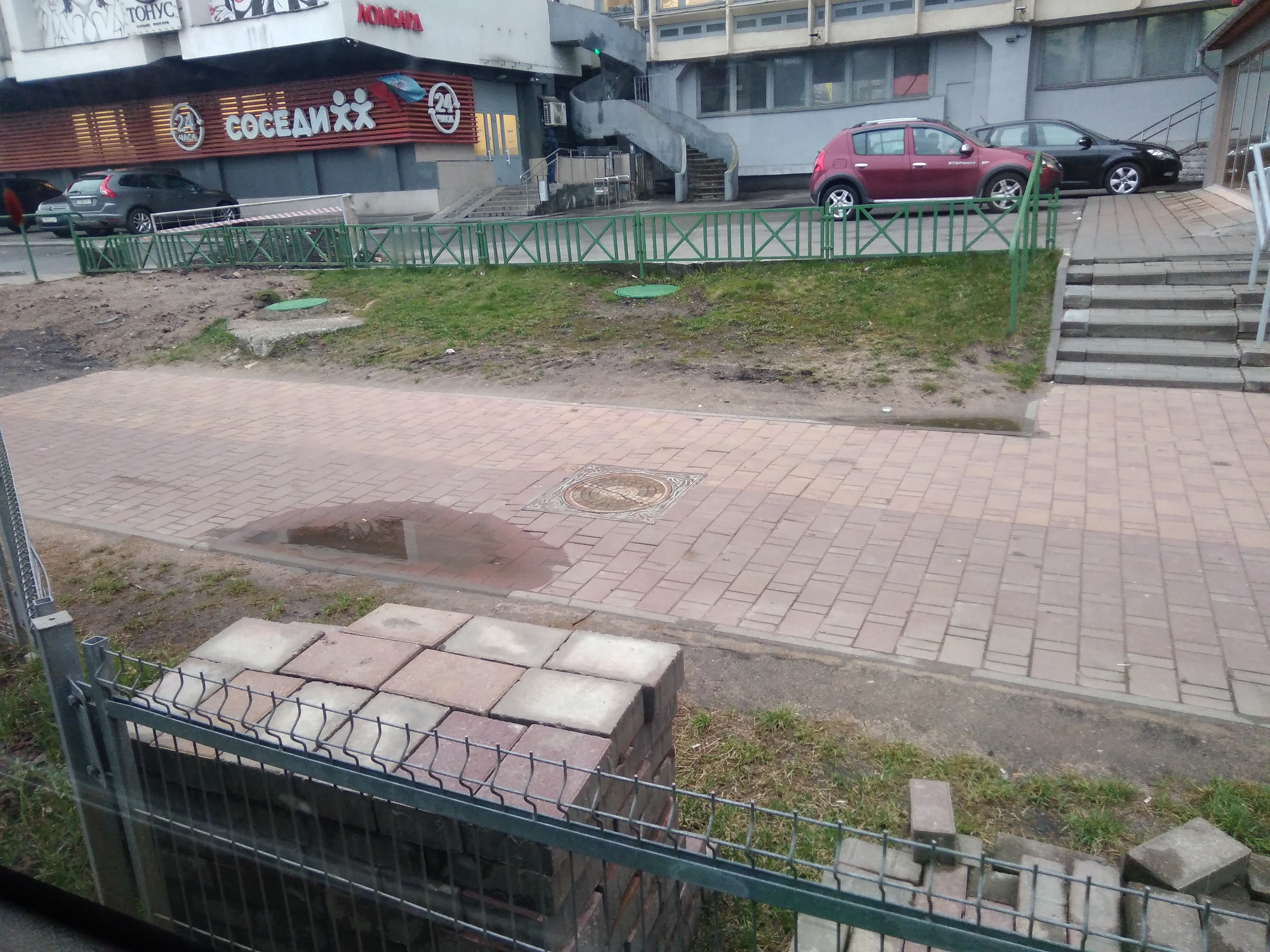 да вот типичный пример: даже плитку переложили криво. в ямку налило воды дождём, нанесло земли с более высокой части газона. Газон не закрыт дёрном. В луже плавают черви, вылезшие на дорожку с первым весенним ливнем... Их ооооочень много этим утром погибло. Я шел на работу, и понимал, что спасать их - дело безнадёжное.