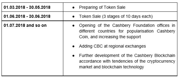 Initially, 90,000,000 CBC will be created, and 5% of them (4,500,000 CBC) will be available for sale during the ICO: the remaining amount will be frozen in Cashbery reserve. Burning coins from the reserve would proceed according to a defined schedule: