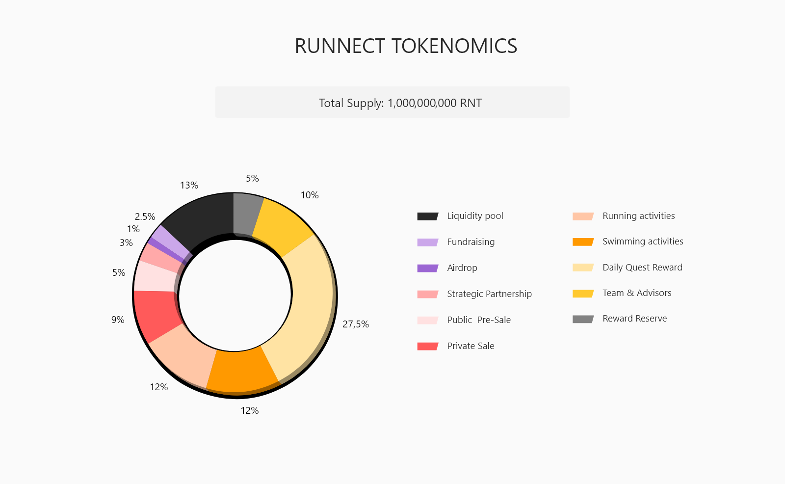 RNTʼs token distribution is broken down as follows. A maximum of 1,000,000,000 RNT will ever be created. Of the Runnect genesis block allocation, 10% of RNT were allocated for Team & Advisors, and 9% of RNT were allocated to Private Sale. The other 27.5% of all tokens were allocated to Daily Quest Reward. A chart reflecting the RNT token allocation is shown in the following figure.