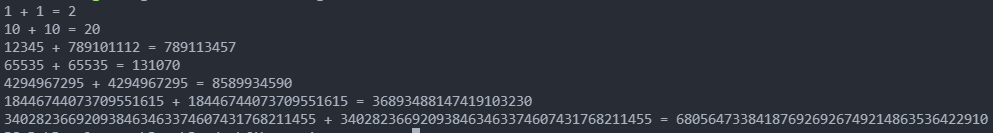 println!("{} + {} = {}", u64::MAX, u64::MAX, addition(u64::MAX.to_string(), u64::MAX.to_string()));