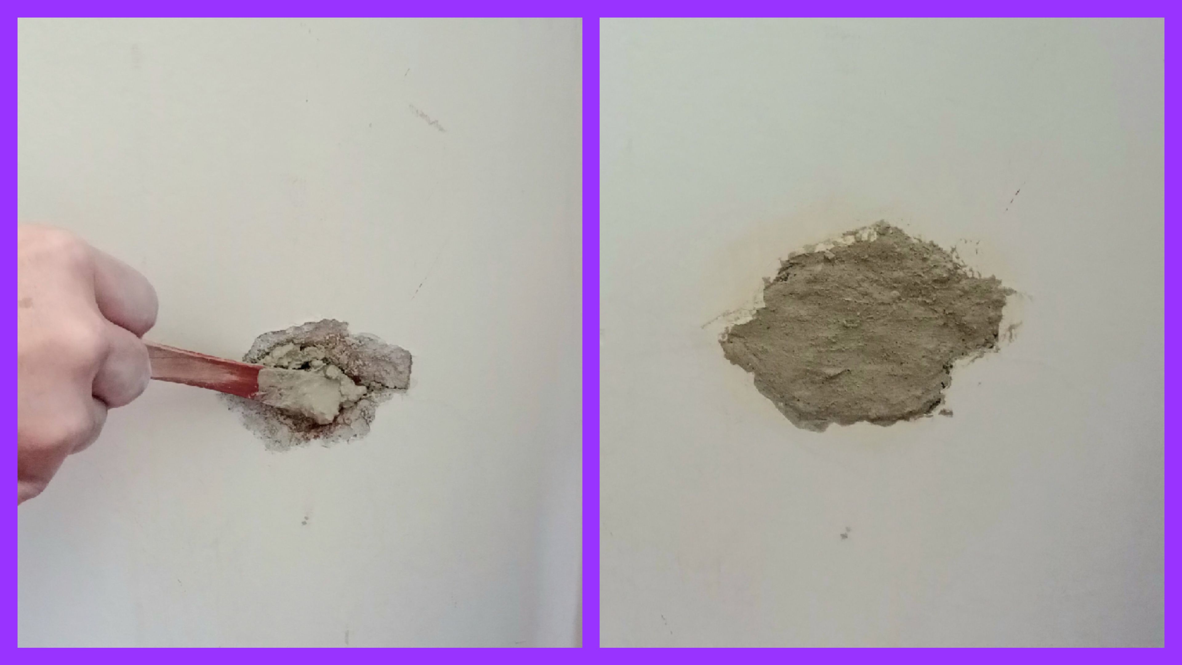 3. Con la misma paleta de helado, empezamos a rellenar con la mezcla el agujero de la pared. Si poseen una espátula, será mucho mejor.