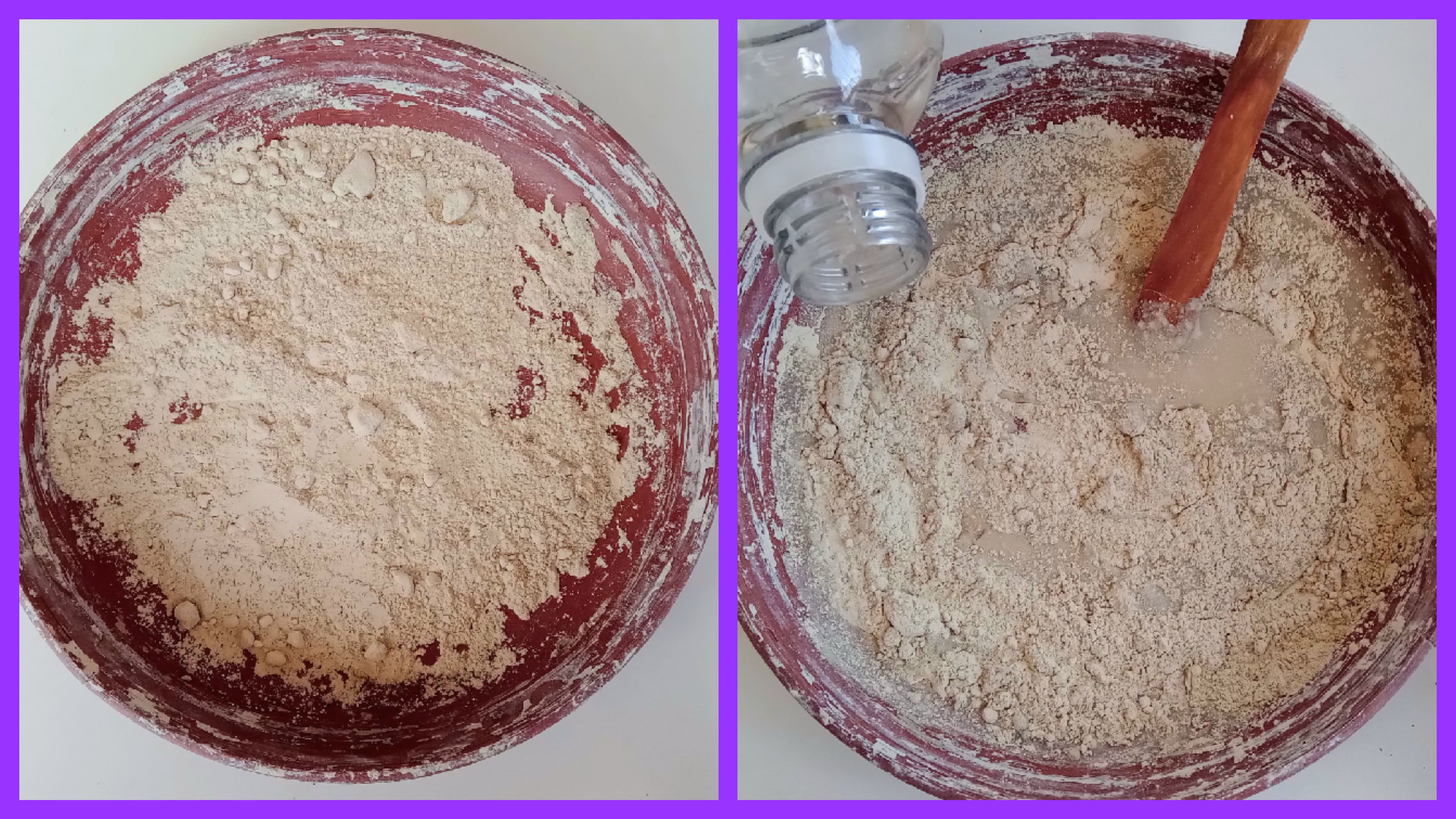 1. Colocar un poco de cemento en el plato plástico, cuya cantidad dependerá del tamaño del agujero. Después debemos aplicar agua para realizar la mezcla.