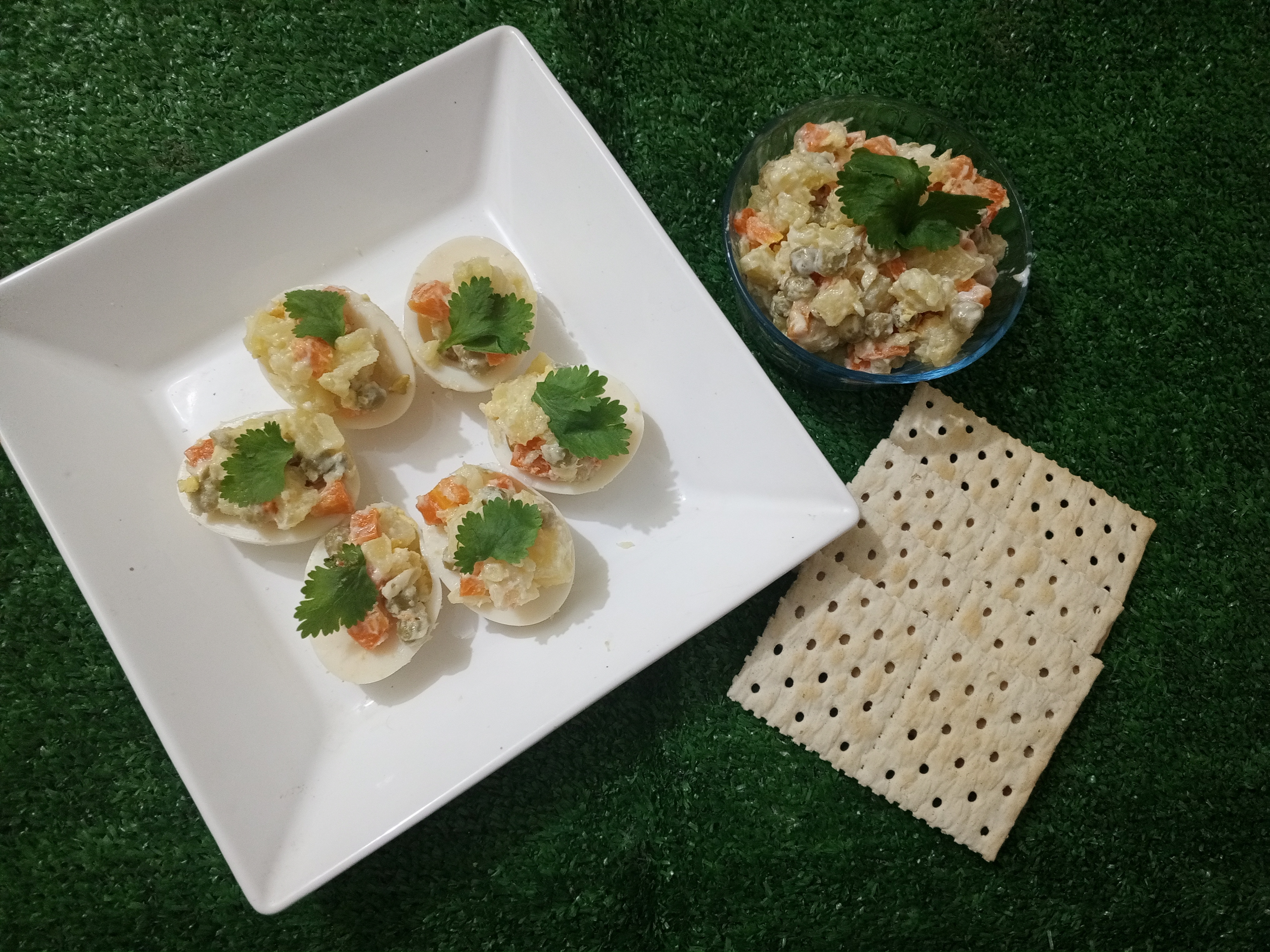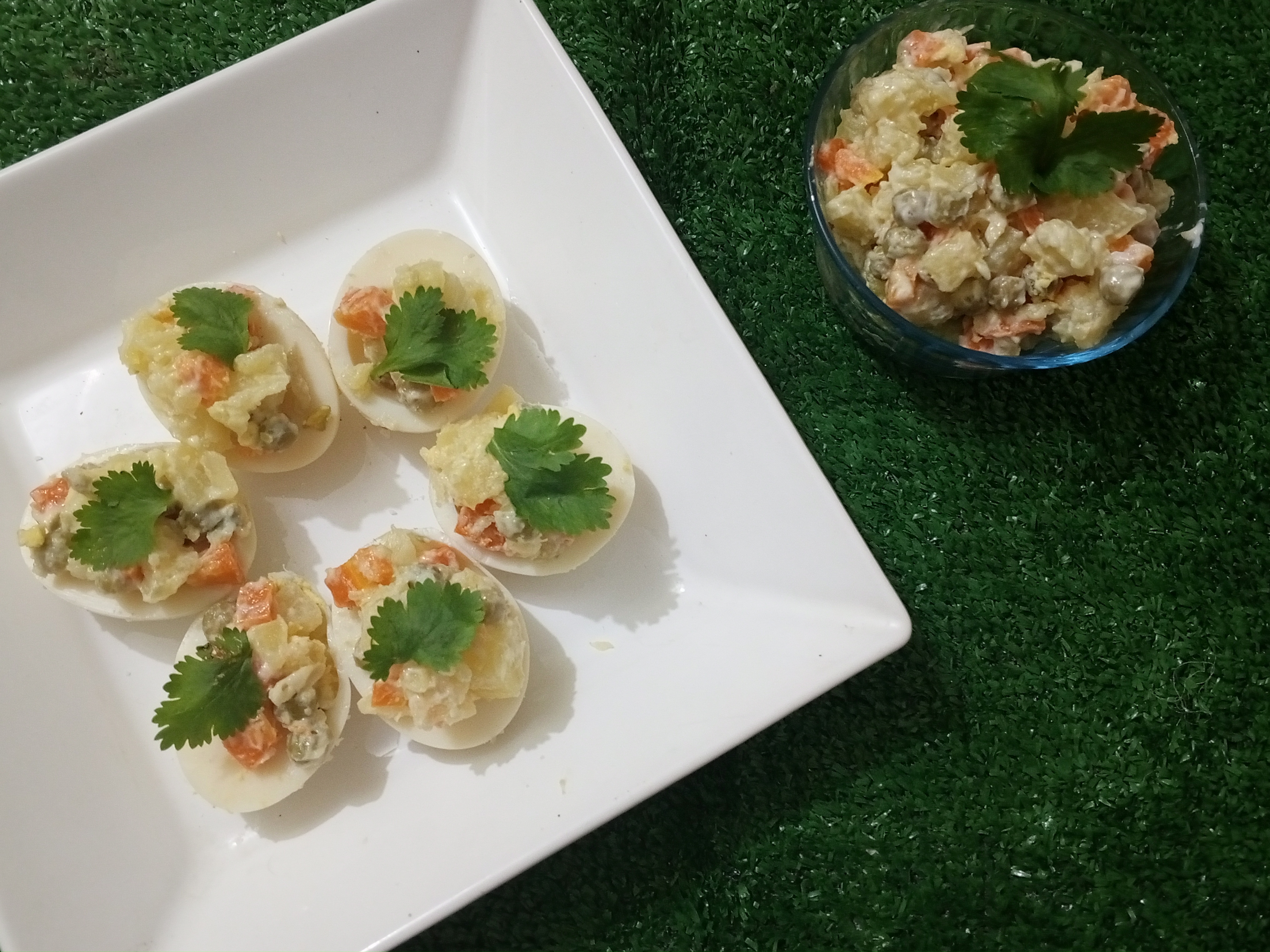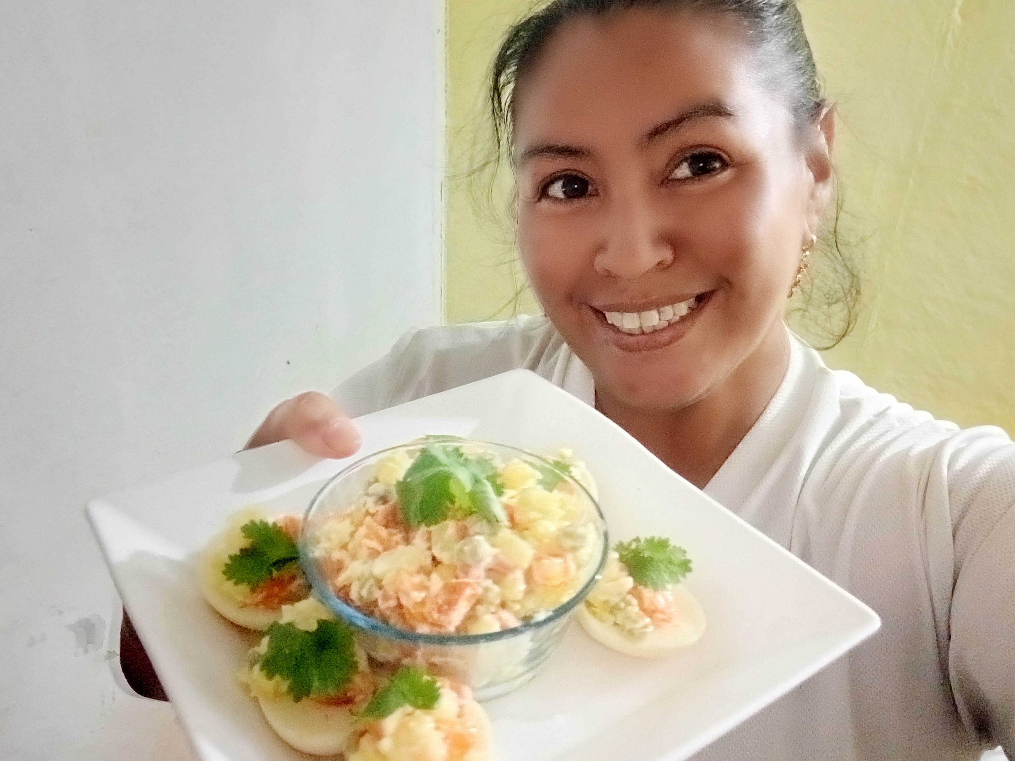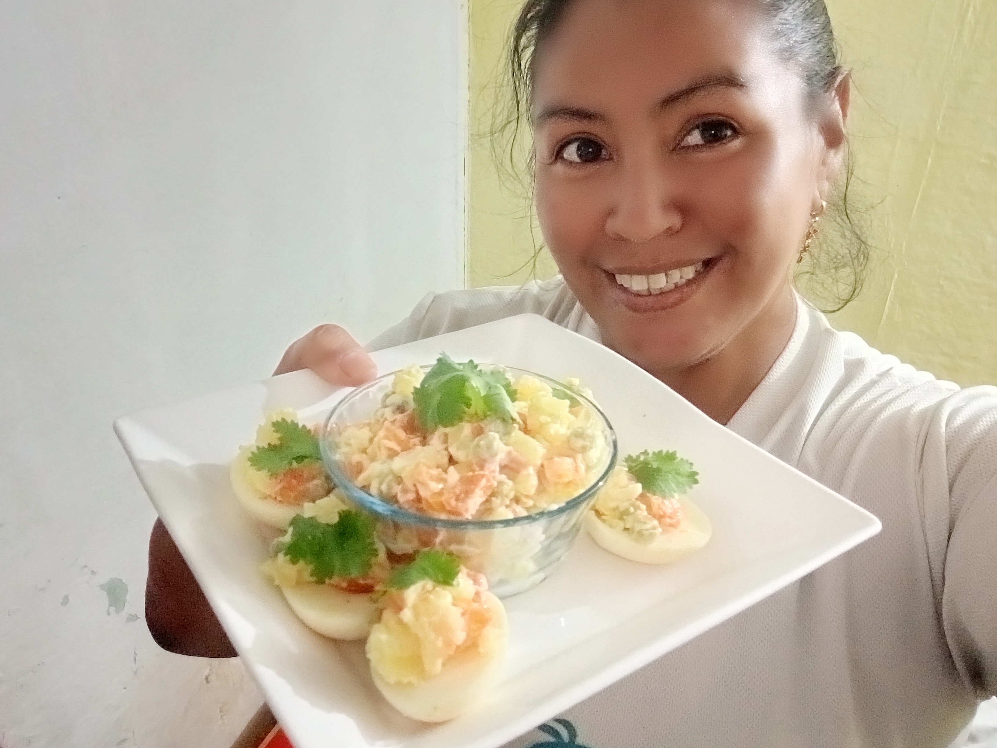🥗Servimos rellenando los huevos para tener una linda presentación y decoramos con una hojita de cilantro.