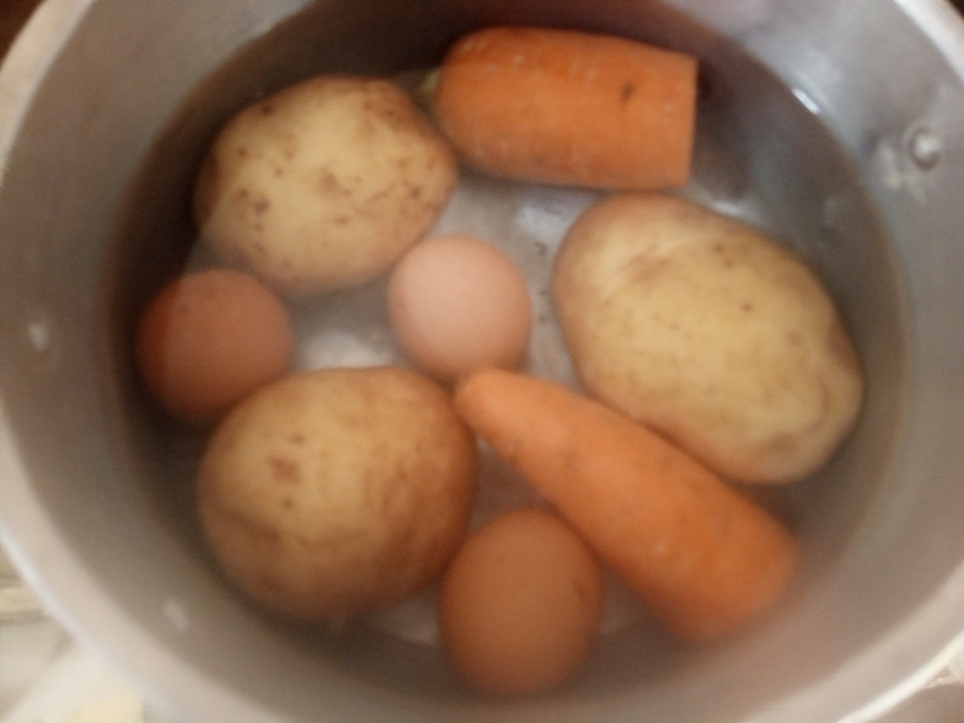 🥗Lo primero que haremos es lavar bien las verduras y ponerlas a sancochar en agua con un toque de sal, ahí mismo vamos a poner los huevos hasta que todo este blando pero no al punto de deshacerse.