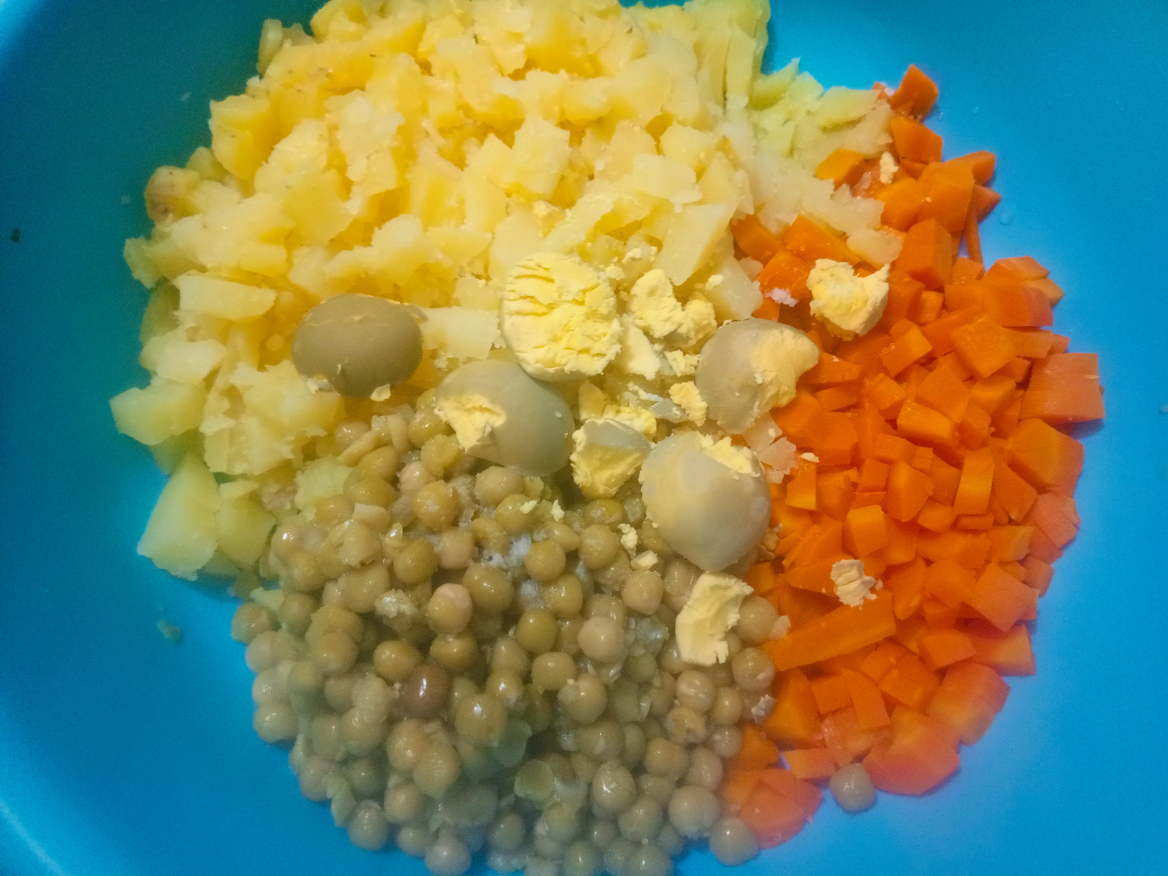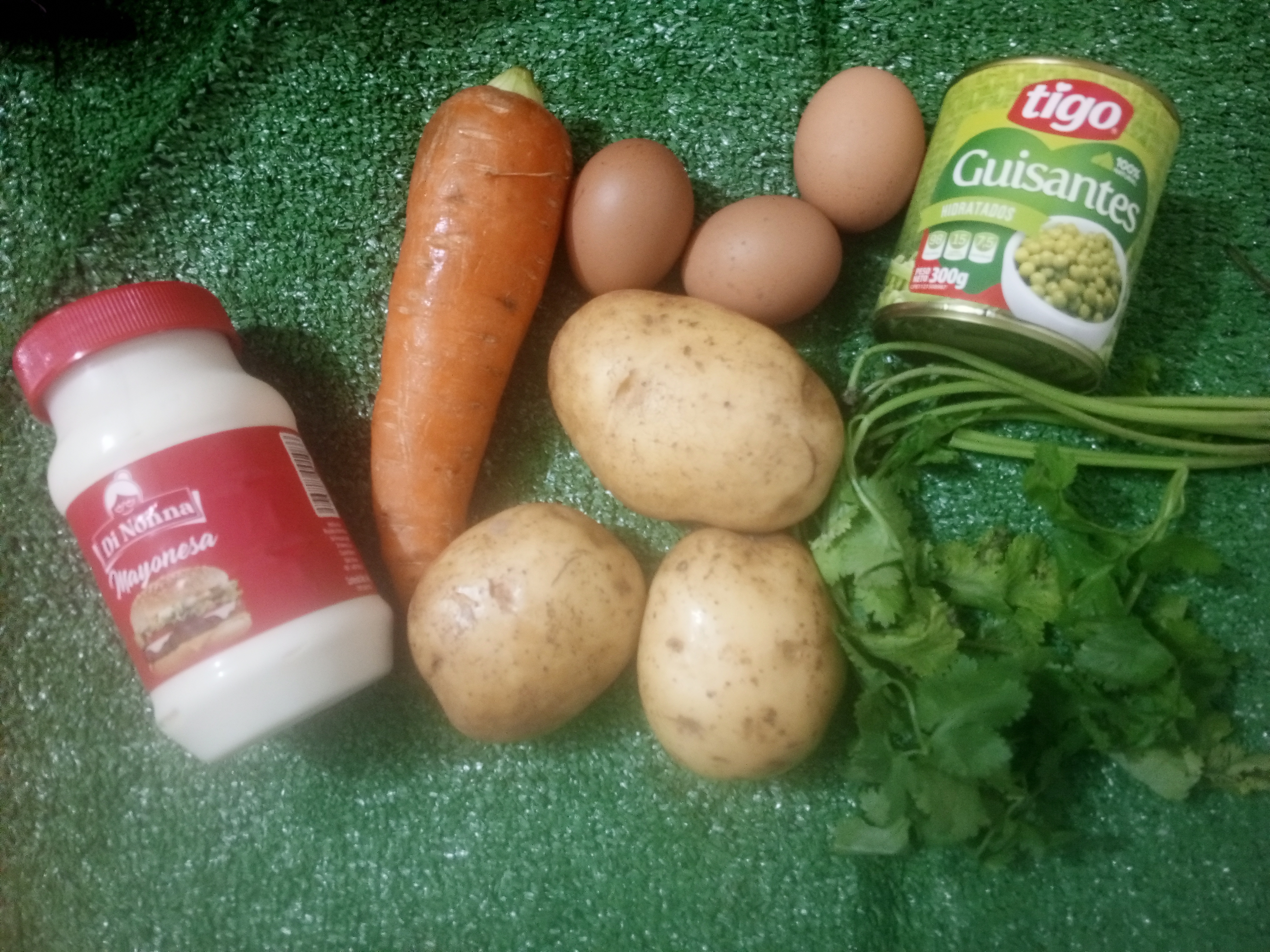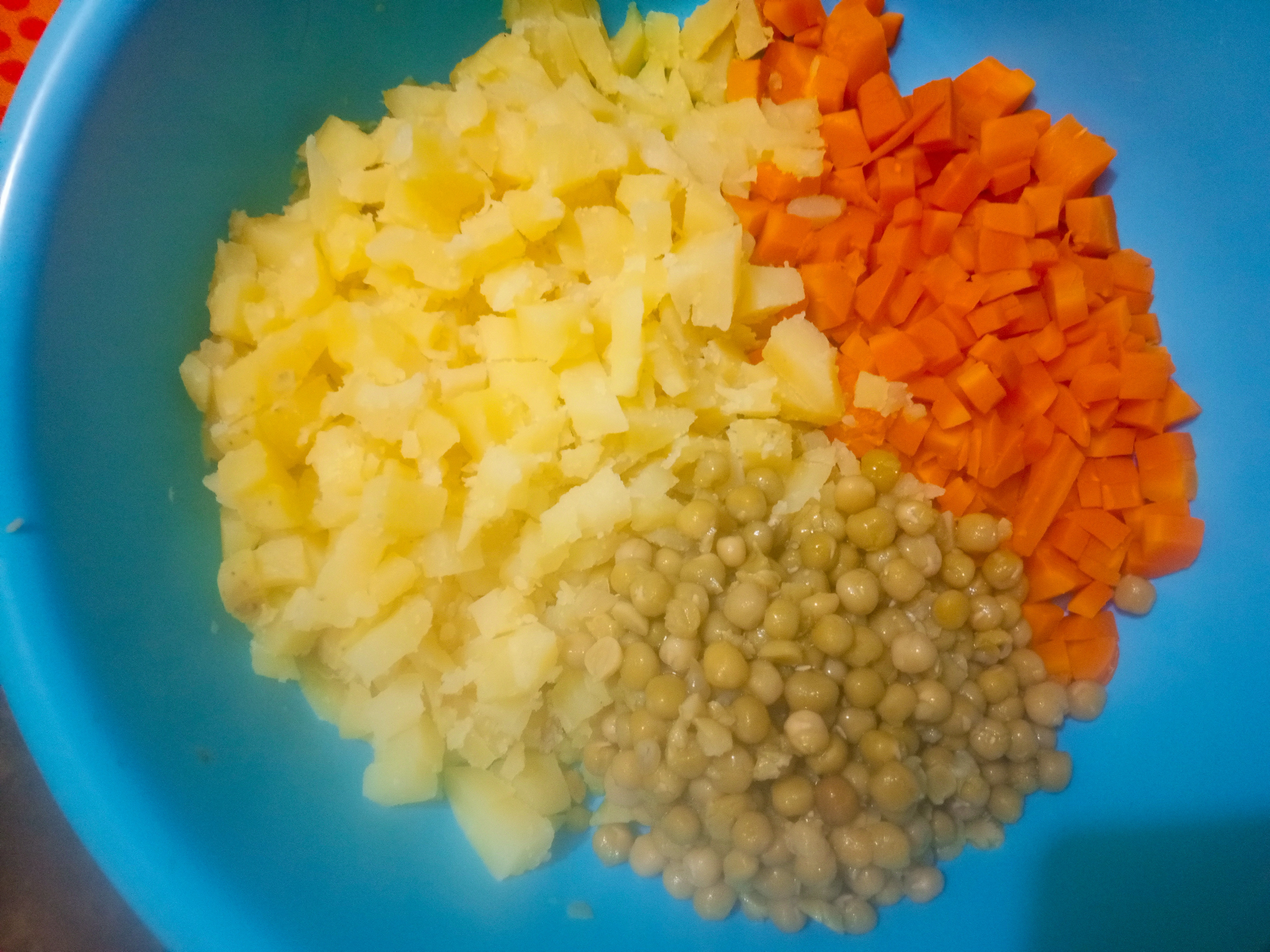 🥗Cortamos la papá y la zanahoria en trozos pequeños y destapamos los guisantes, escurrimos el agua y enjuagamos.