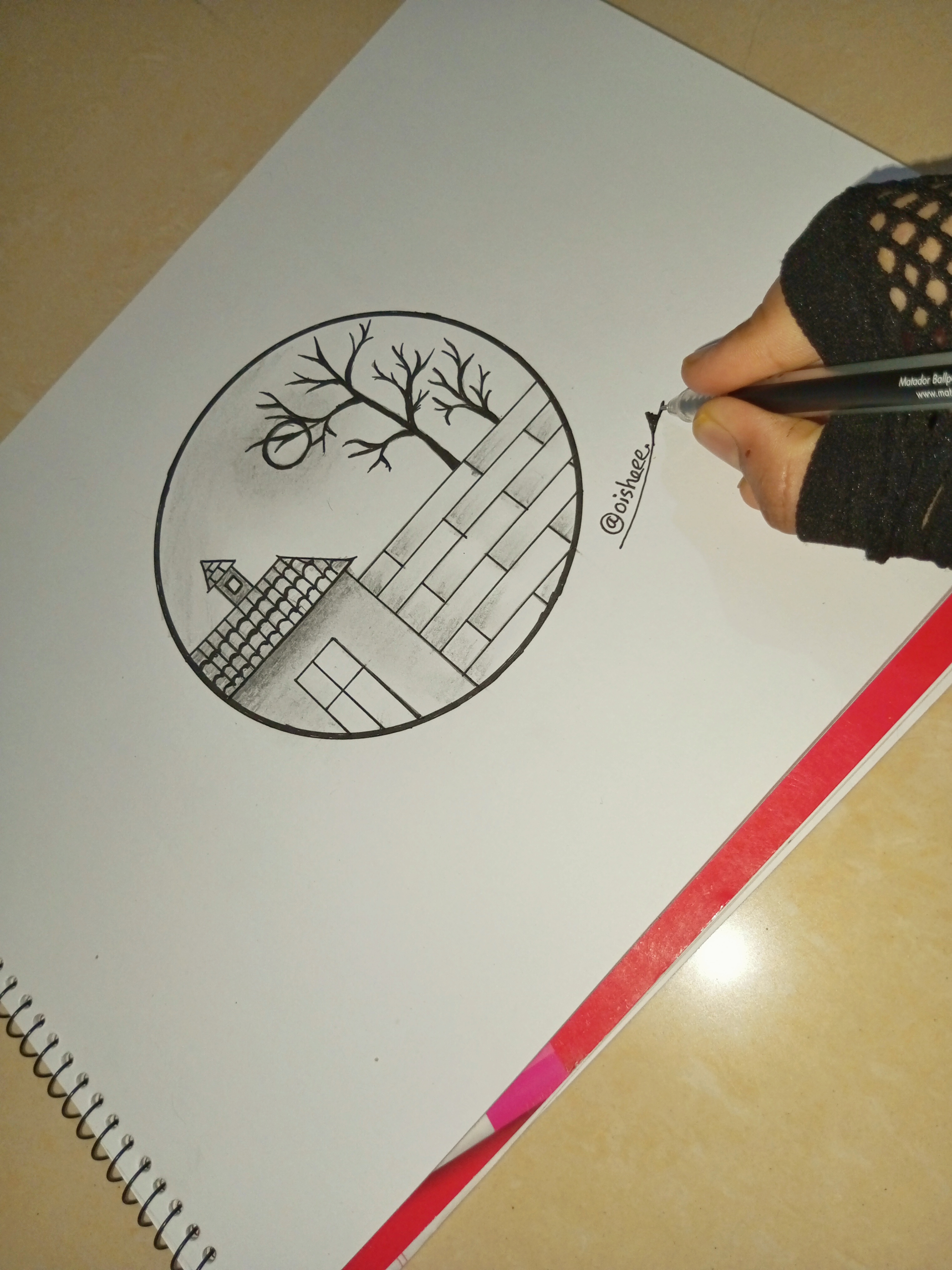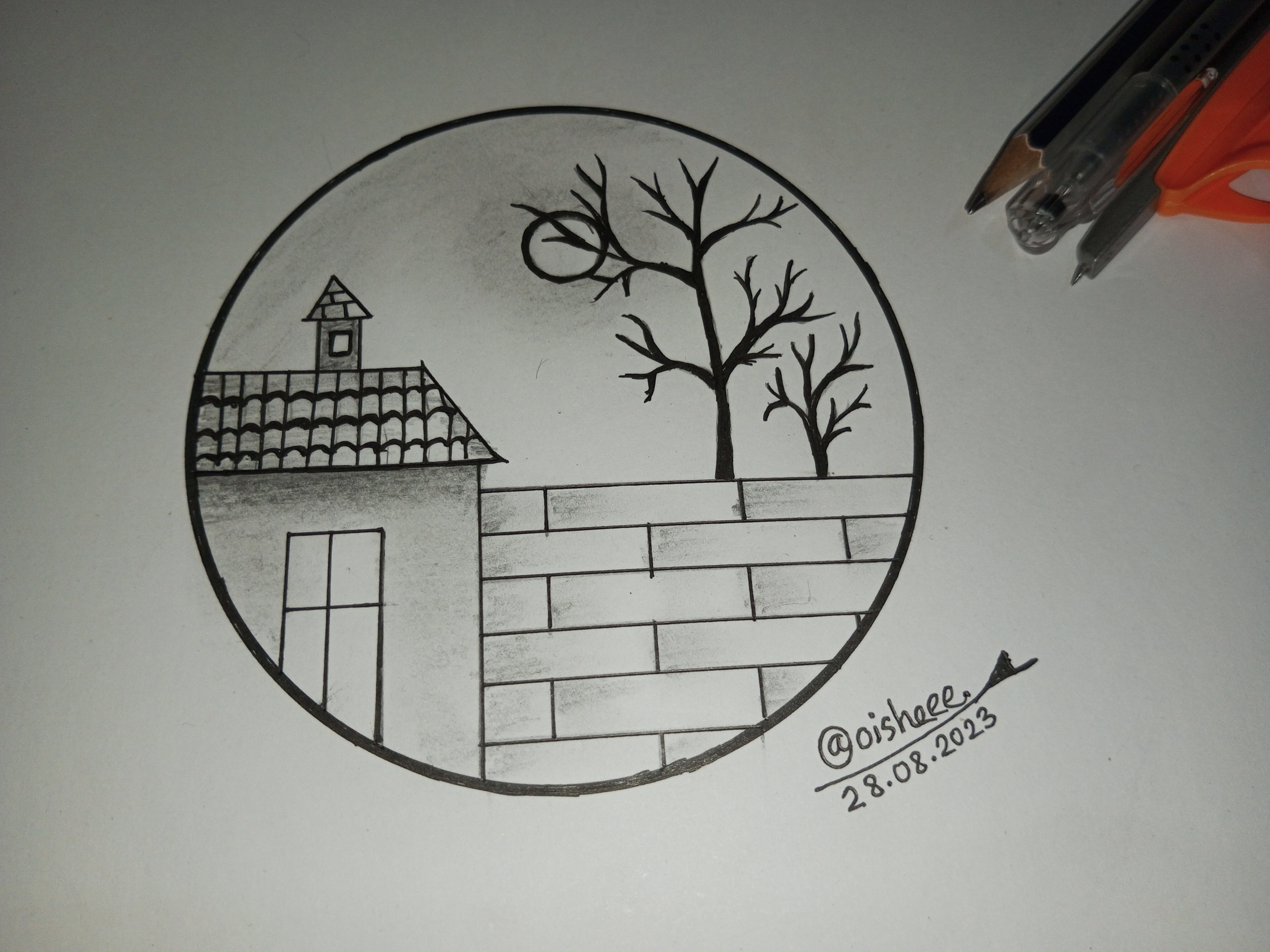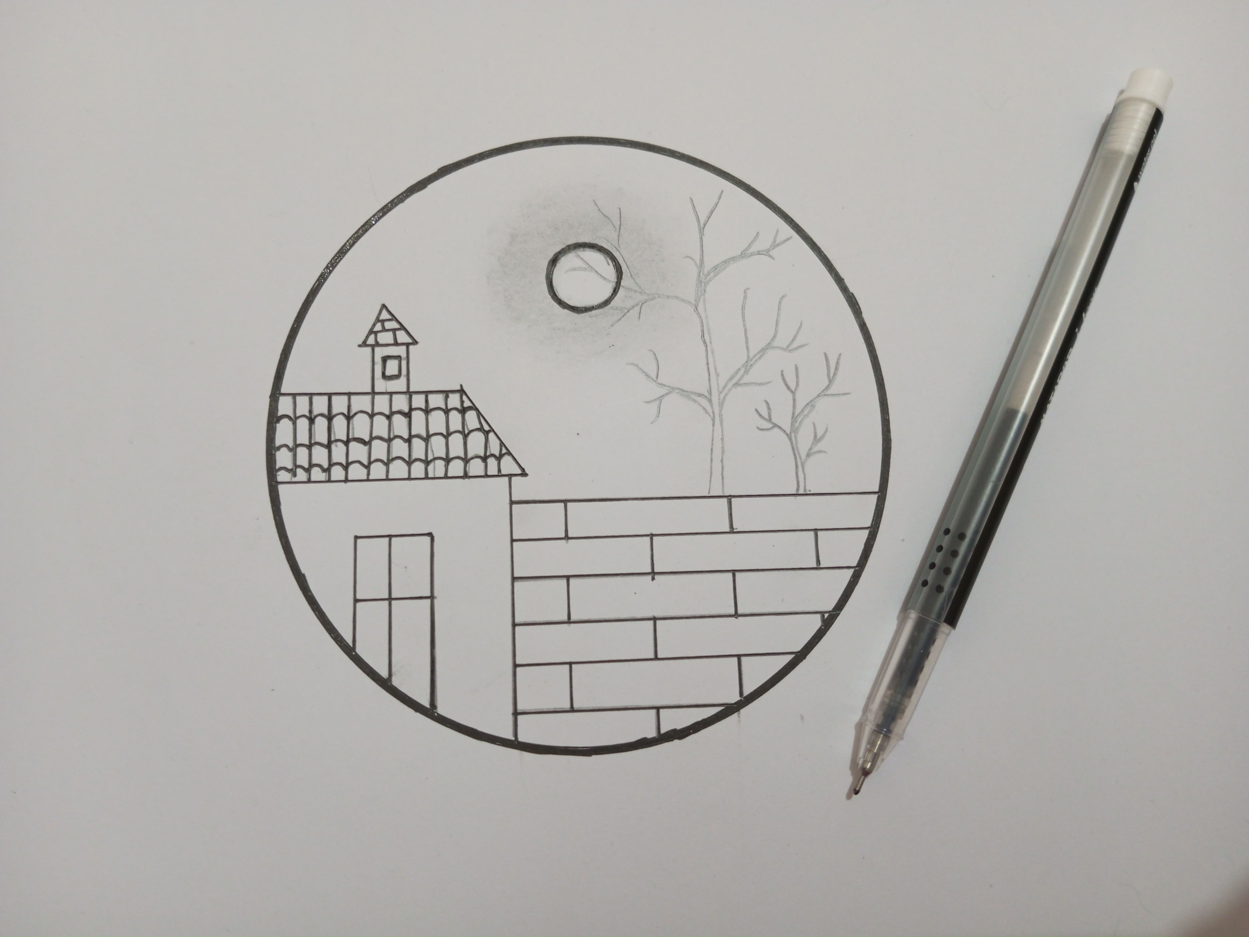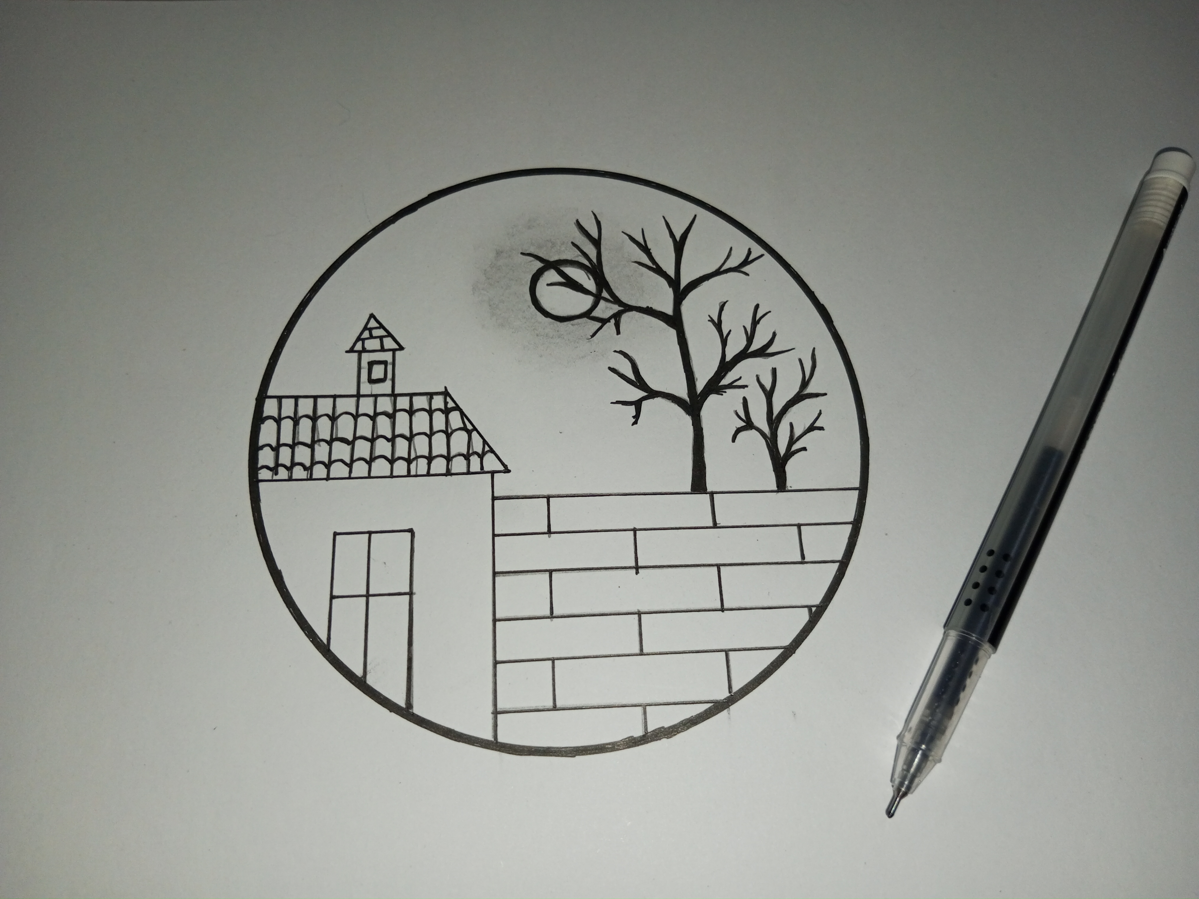 প্রথম স্টেপে আমি পেন্সিল এবং কাটা কম্পাস এর সাহায্যে একটি বৃত্ত আঁকিয়ে নিয়েছে। তারপর জেল কলমের সাহায্যে বৃত্তের বর্ডারটা একটু মোটা করে নিয়েছি ।